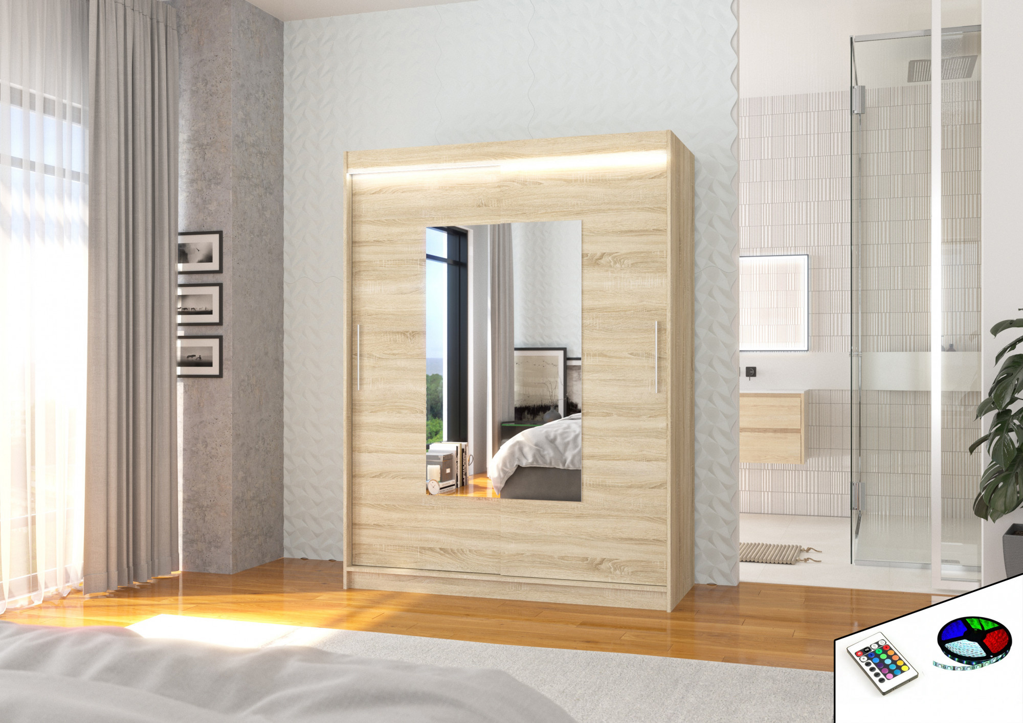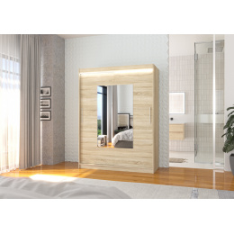 Tolóajtós szekrény tükörrel és LED világítással DORRIGO 150 Sonoma+Sonoma
