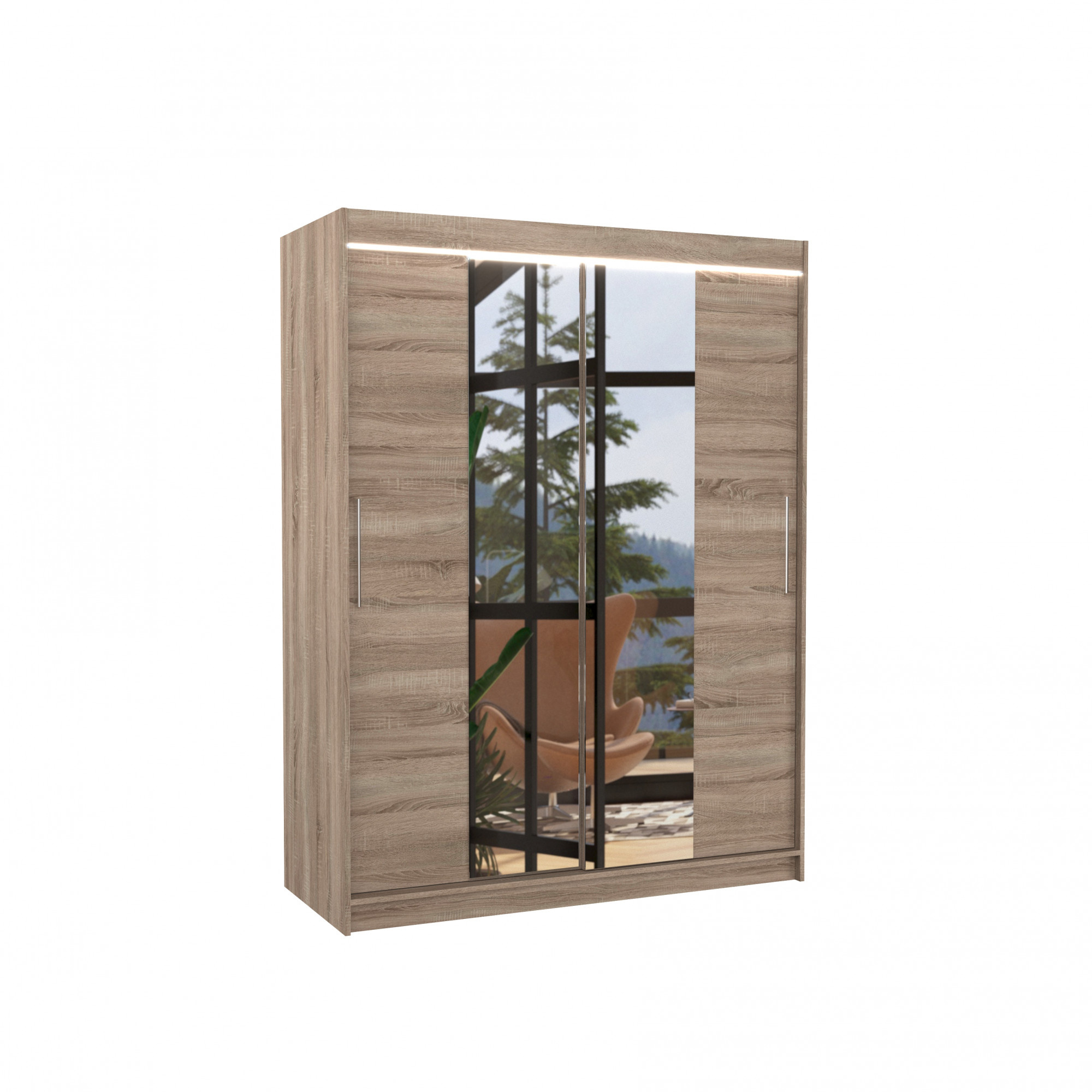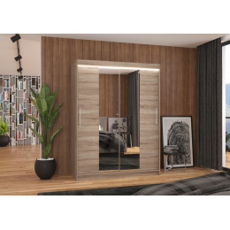 A tolóajtós és tükrös INESS gardróbszekrény ideális módja a tér rendezésének. A bútor tágas polcokkal és egy rúddal van felszerelve, amelyre felakaszthatja a ruhákat, öltönyöket, felsőruházatot vagy ingeket. Mindkét oldalon tükrök voltak rögzítve, amelyek optikailag növelik a teret. Annak köszönhetően, hogy a szekrény tolóajtós, nem kell további helyet biztosítani az ajtók kinyitásához, ami ideális megoldássá teszi egy kis szoba vagy keskeny előszoba számára. Érdekes elem a látványos LED világítás, amely csodálatos bájt kölcsönöz a szekrénynek és a helyiségnek is.