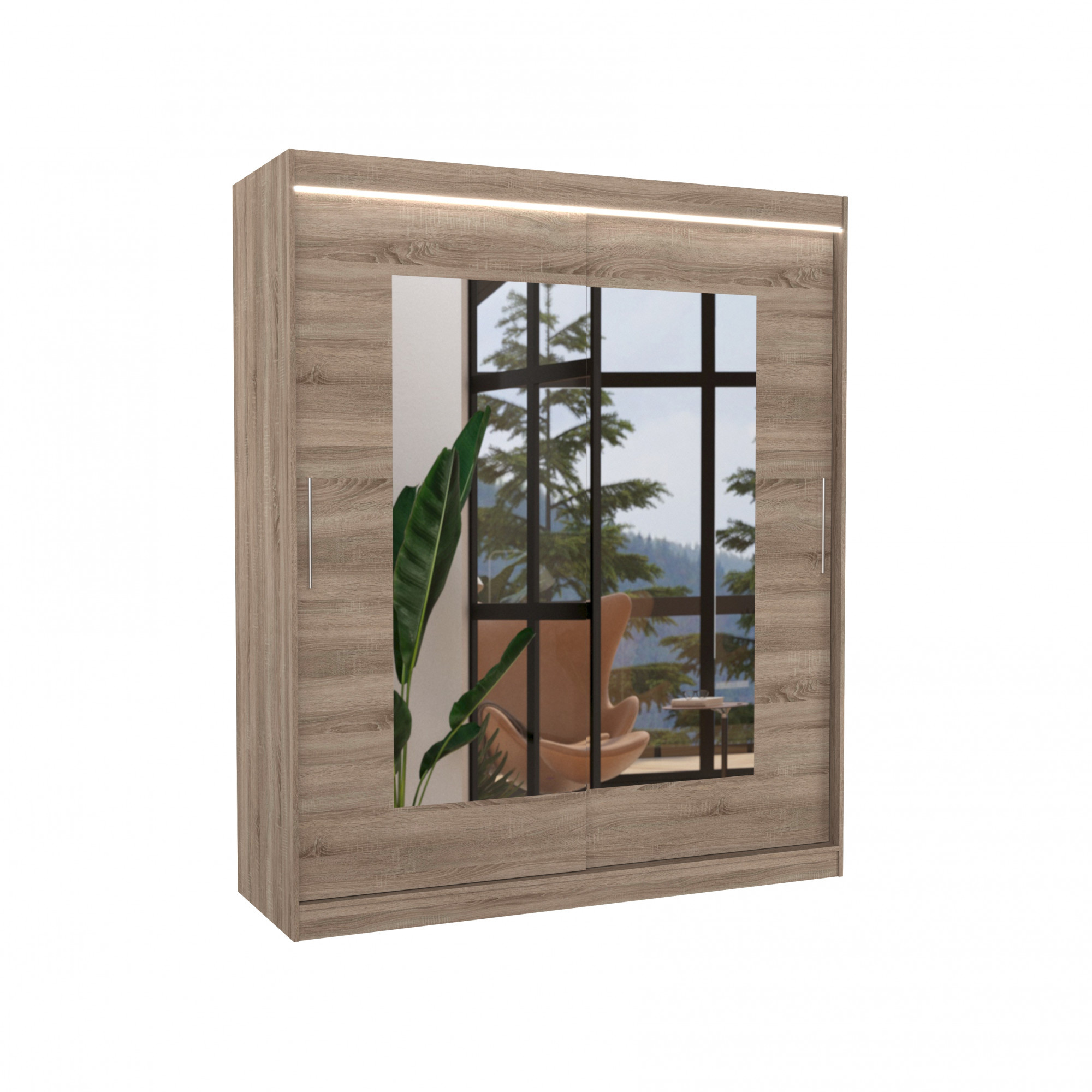 A tolóajtós és tükrös ROSETTE gardróbszekrény ideális módja a tér rendezésének. A bútor tágas polcokkal és egy rúddal van felszerelve, amelyre felakaszthatja a ruhákat, öltönyöket, felsőruházatot vagy ingeket. Az elülső oldalra tükröket szereltek, amelyek optikailag növelik a teret. Annak köszönhetően, hogy a szekrény tolóajtós, nem kell további helyet biztosítani az ajtók kinyitásához, ami ideális megoldássá teszi egy kis szoba vagy keskeny előszoba számára. Érdekes elem a látványos LED világítás, amely csodálatos bájt kölcsönöz a szekrénynek és a helyiségnek is.