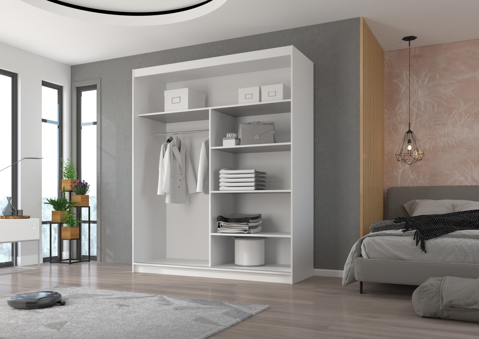 A tolóajtós és tükrös ESTI ruhásszekrény ideális módja a tér rendezésének. A bútor tágas polcokkal és egy rúddal van felszerelve, amelyre felakaszthatja a ruhákat, öltönyöket, felsőruházatot vagy ingeket. Az elülső oldalra tükröket rögzítettek, amelyek optikailag megnövelik a teret és varázslatos bájt kölcsönöznek neki. Annak köszönhetően, hogy a szekrény tolóajtós, nem kell további helyet biztosítani az ajtók kinyitásához, ami ideális megoldássá teszi egy kis szoba vagy keskeny előszoba számára.