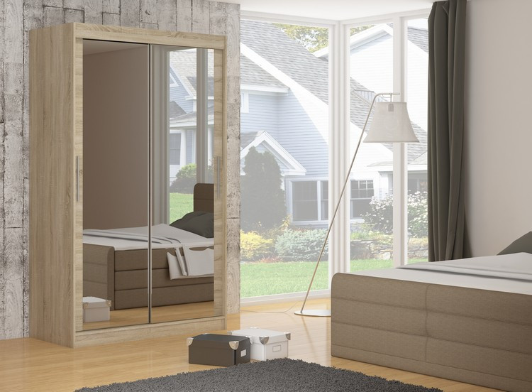A tolóajtós és tükrös ETTORE ruhásszekrény ideális módja a tér rendezésének. A bútor tágas polcokkal és egy rúddal van felszerelve, amelyre felakaszthatja a ruhákat, öltönyöket, felsőruházatot vagy ingeket. Az elülső oldalra tükröket szereltek, amelyek optikailag növelik a teret. Annak köszönhetően, hogy a szekrény tolóajtós, nem kell további helyet biztosítani az ajtók kinyitásához, ami ideális megoldássá teszi egy kis szoba vagy keskeny előszoba számára.