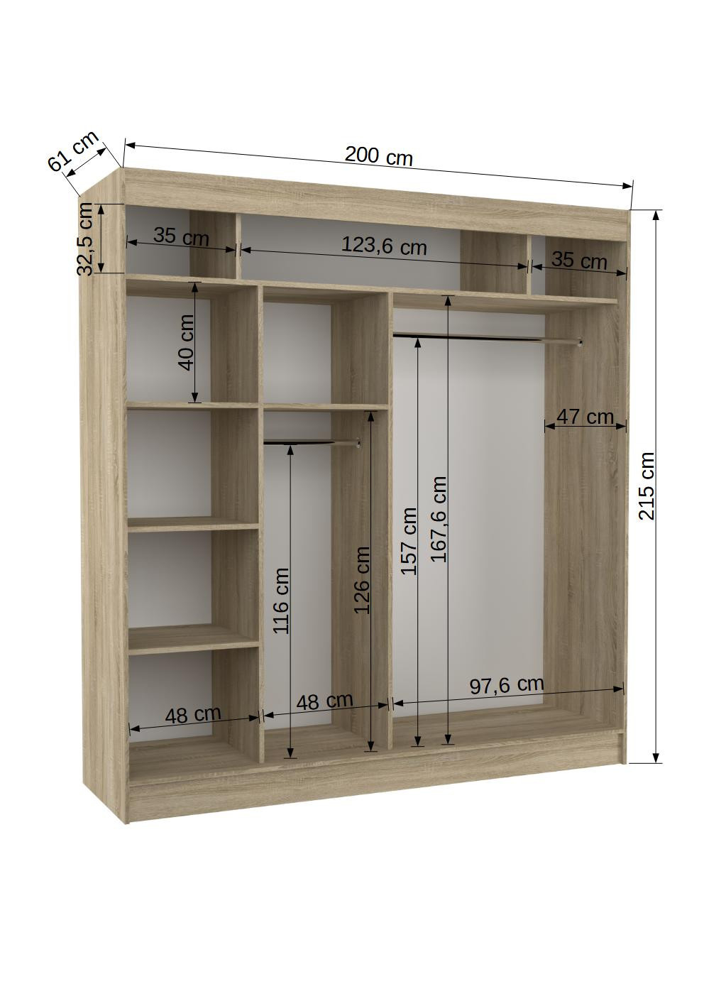 A GILTON tolóajtós és tükrös ruhásszekrény ideális módja a tér rendezésének. A bútor tágas polcokkal és egy rúddal van felszerelve, amelyre felakaszthatja a ruhákat, öltönyöket, felsőruházatot vagy ingeket. Az elülső oldalra tükör és díszítő szalagok voltak rögzítve, amelyek egyedi stílust kölcsönöznek. Annak köszönhetően, hogy a szekrény tolóajtós, nem kell további helyet biztosítani az ajtók kinyitásához, ami ideális megoldássá teszi egy kis szoba vagy keskeny előszoba számára.