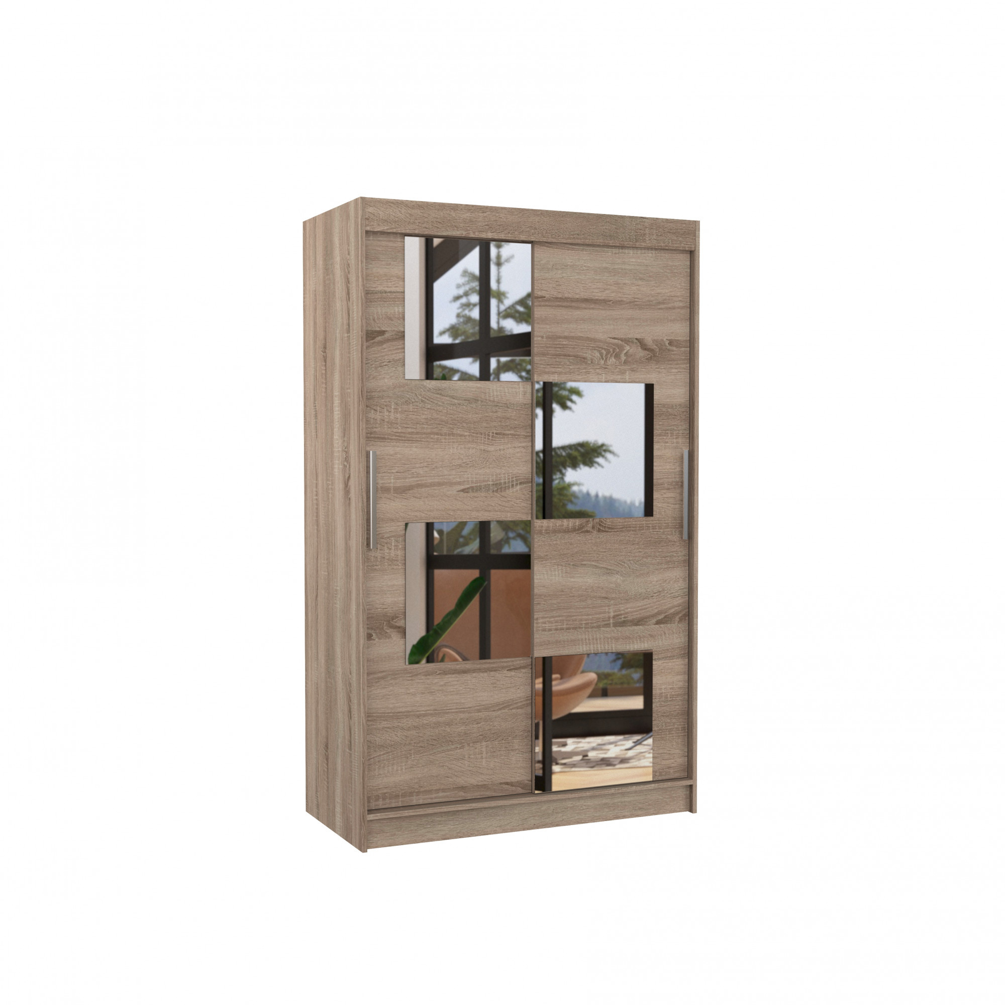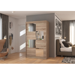 A LUGANO tolóajtós szekrény tükörrel ideális módja a tér rendezésének. A bútor tágas polcokkal és egy rúddal van felszerelve, amelyre felakaszthatja a ruhákat, öltönyöket, felsőruházatot vagy ingeket. Az elülső oldalon jellegzetes tükrök voltak rögzítve, amelyek optikailag növelik a teret, miközben egyedi stílust kölcsönöznek. Annak köszönhetően, hogy a szekrény tolóajtós, nem kell további helyet biztosítani az ajtók kinyitásához, ami ideális megoldássá teszi egy kis szoba vagy keskeny előszoba számára.