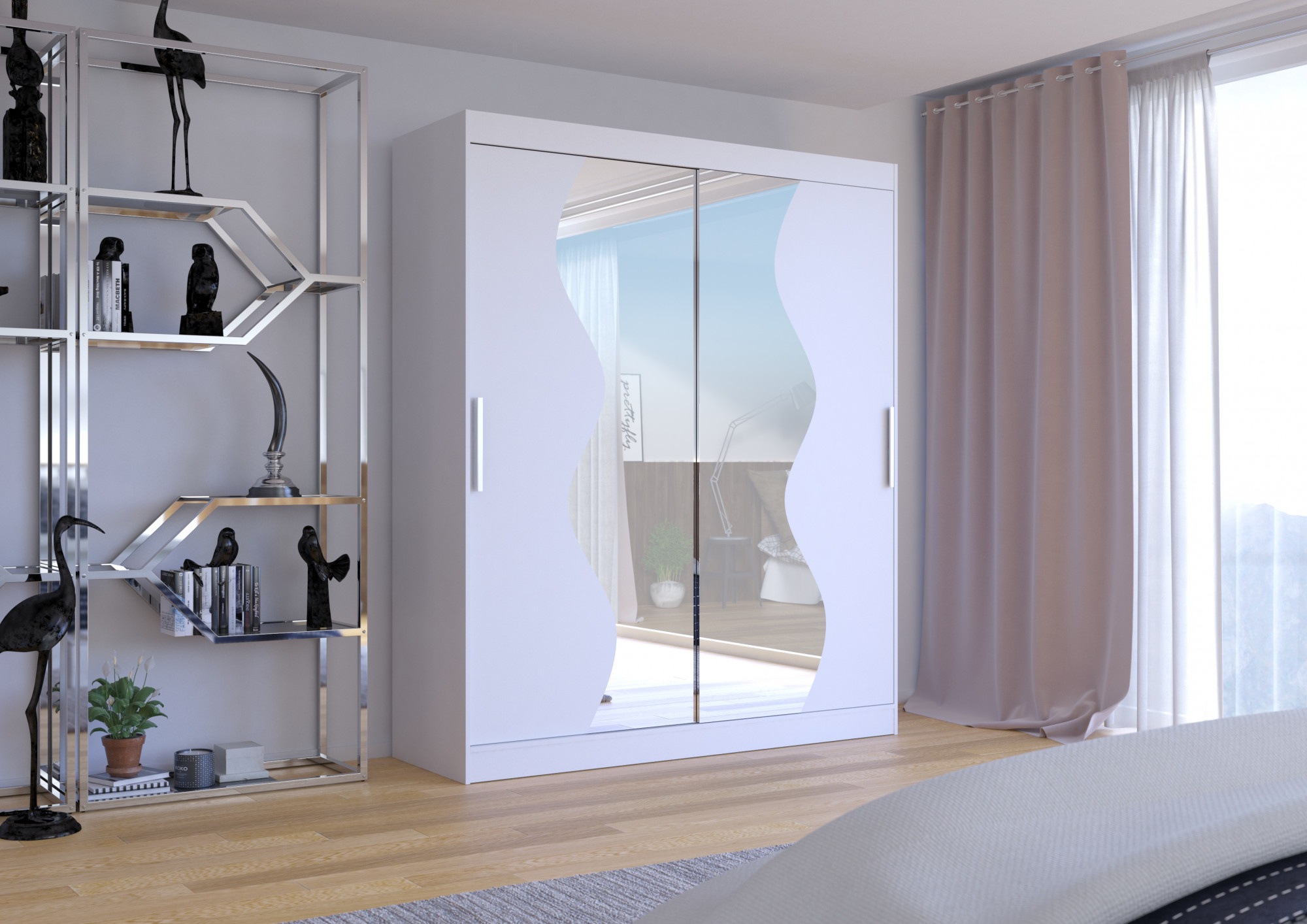 A MEDISON tolóajtós és tükrös ruhásszekrény ideális módja a tér rendezésének. A bútor tágas polcokkal és egy rúddal van felszerelve, amelyre felakaszthatja a ruhákat, öltönyöket, felsőruházatot vagy ingeket. Az elülső oldalra tükröket szereltek, amelyek optikailag növelik a teret. Annak köszönhetően, hogy a szekrény tolóajtós, nem kell további helyet biztosítani az ajtók kinyitásához, ami ideális megoldássá teszi egy kis szoba vagy keskeny előszoba számára.