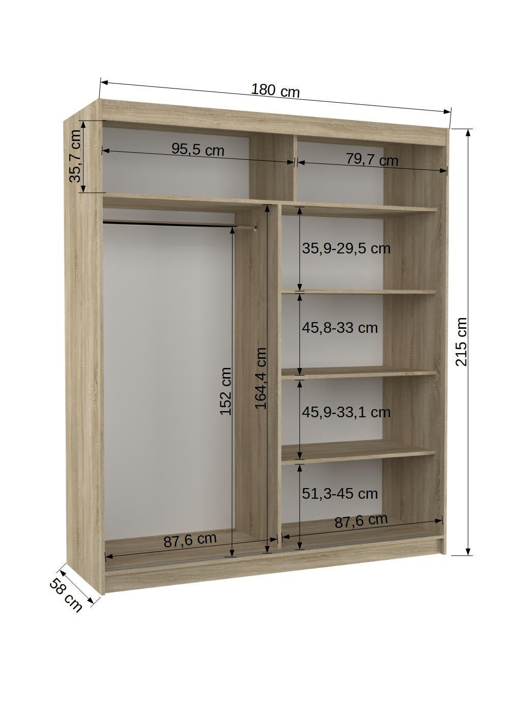 A MEDISON tolóajtós és tükrös ruhásszekrény ideális módja a tér rendezésének. A bútor tágas polcokkal és egy rúddal van felszerelve, amelyre felakaszthatja a ruhákat, öltönyöket, felsőruházatot vagy ingeket. Az elülső oldalra tükröket szereltek, amelyek optikailag növelik a teret. Annak köszönhetően, hogy a szekrény tolóajtós, nem kell további helyet biztosítani az ajtók kinyitásához, ami ideális megoldássá teszi egy kis szoba vagy keskeny előszoba számára.