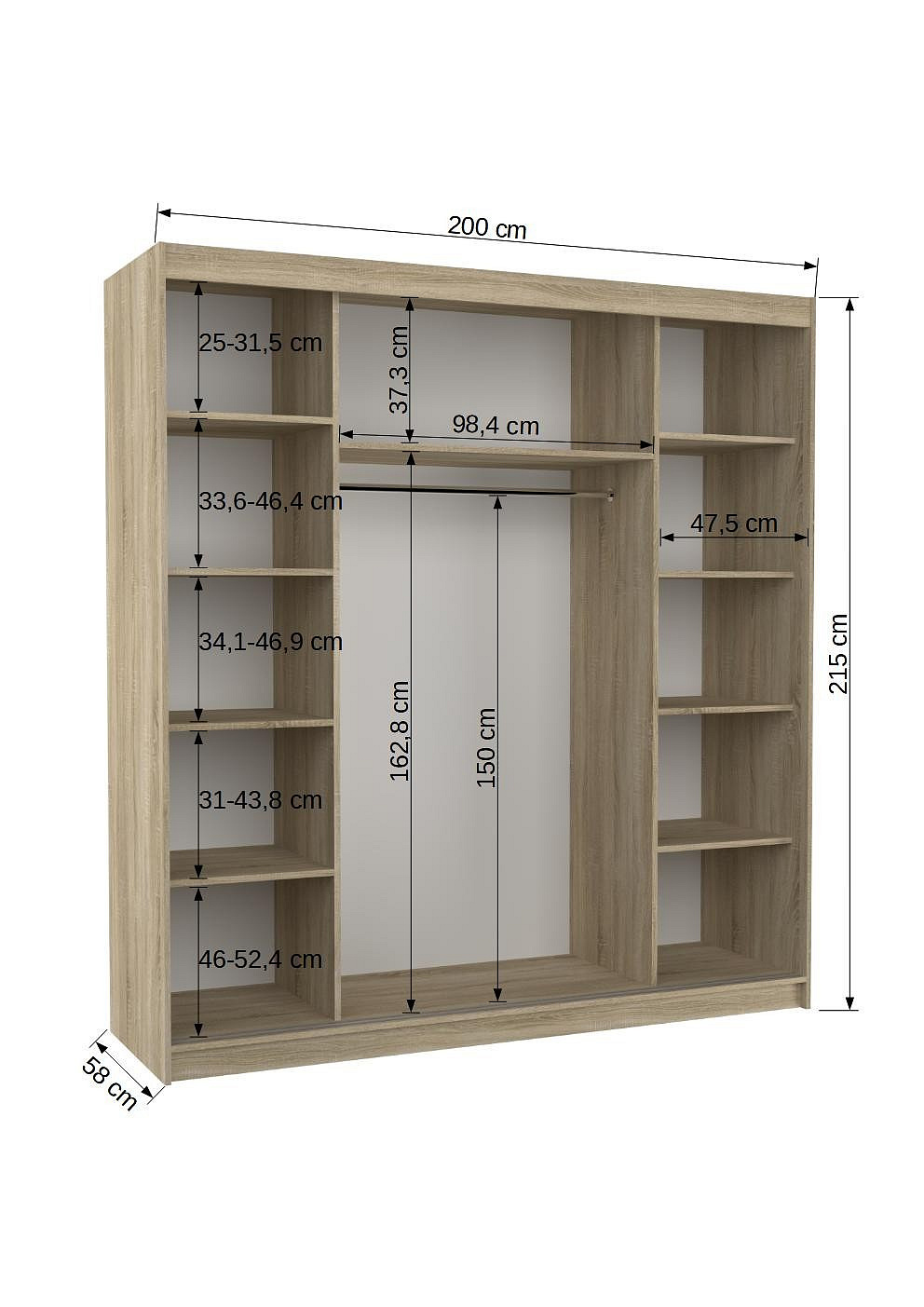 Az OLIVER tolóajtós ruhásszekrény ideális módja a tér rendezésének. A bútor tágas polcokkal és egy rúddal van felszerelve, amelyre felakaszthatja a ruhákat, öltönyöket, felsőruházatot vagy ingeket. Az elülső oldalon található egy tükör és jellegzetes vízszintes csíkok ezüst színben, amelyek különleges stílust kölcsönöznek a bútornak. Annak köszönhetően, hogy a szekrény tolóajtós, nem kell további helyet biztosítani az ajtók kinyitásához, ami ideális megoldássá teszi egy kis szoba vagy keskeny előszoba számára.