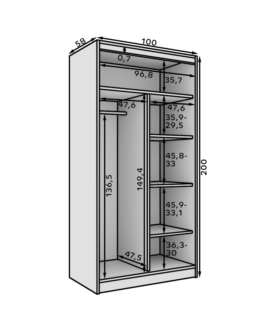 A Verto 100 szekrény funkcionális és esztétikus berendezési elem, amely tökéletesen illeszkedik bármely belső térbe. 16 mm vastag laminált lemezből készült, amely ellenáll a sérüléseknek és könnyen karbantartható. Modern alumínium vezetősínekkel rendelkezik, amelyek biztosítják az ajtók sima és csendes mozgatását. Az egyszerű kialakításnak és a masszív szerkezetnek köszönhetően a Verto 100 szekrény kiváló választás hálószobába, előszobába vagy irodába, ötvözve a funkcionalitást az elegáns megjelenéssel.