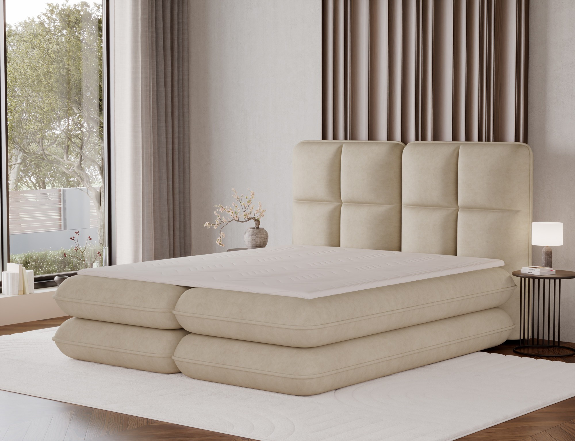 The Tonila bed is a modern and functional upholstered bed that combines sleeping comfort with practical solutions for the bedroom, making it an excellent choice for both contemporary and classic interiors; its solid construction with a height of 127 cm and a length of 235 cm ensures stability and comfortable back support, while the seat filling consisting of T2130 foam (storage box), bonell springs, and T2540 foam with a thickness of 2.5 cm provides proper body support and a high level of everyday comfort; the bed is equipped with a practical bedding storage compartment, which helps keep the bedroom organized, and the overall design is complemented by black furniture legs that add a modern and lightweight character; the Tonila model is available in three popular sizes: 140x200 cm, 160x200 cm, and 180x200 cm, allowing easy adjustment to the size of the room and individual needs, making it a comfortable, durable, and stylish bed for the bedroom.