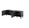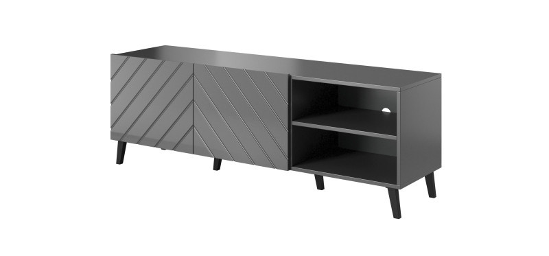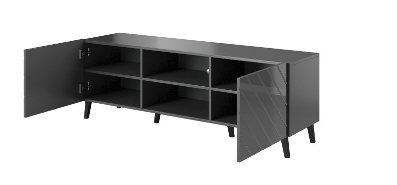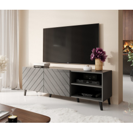 A szekrényben lévő RTV szekrény elülső részét tetszőlegesen lehet változtatni, hogy bárhol nyitott tér legyen. méretek: m/sz/mé-52cm/150cm/41,6cm, Anyag: Korpusz: matt laminált lap 16mm Előlapok: laminált MDF lap PVC fóliával bevonva 16mm látható kivágásokkal Élek: ABS 0,45mm Lábak: fekete színű műanyag Fogantyúk: nincsenek, az előlapok a felső részen túlnyúlnak