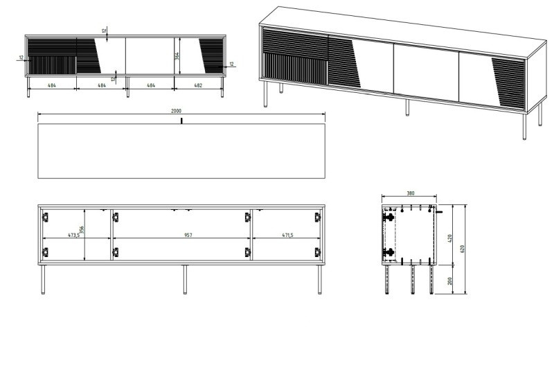 szafka RTV wymiary:w/s/g-62cm/200cm/38cm, materiał: Korpus: płyta wiórowa laminowana 16mm Fronty: płyta MDF 18mm Obrzeże: ABS 0,45mm Nóżki: metalowe, czarne ( wys. 20 cm ) Uchwyty: brak, PUSH - CLICK