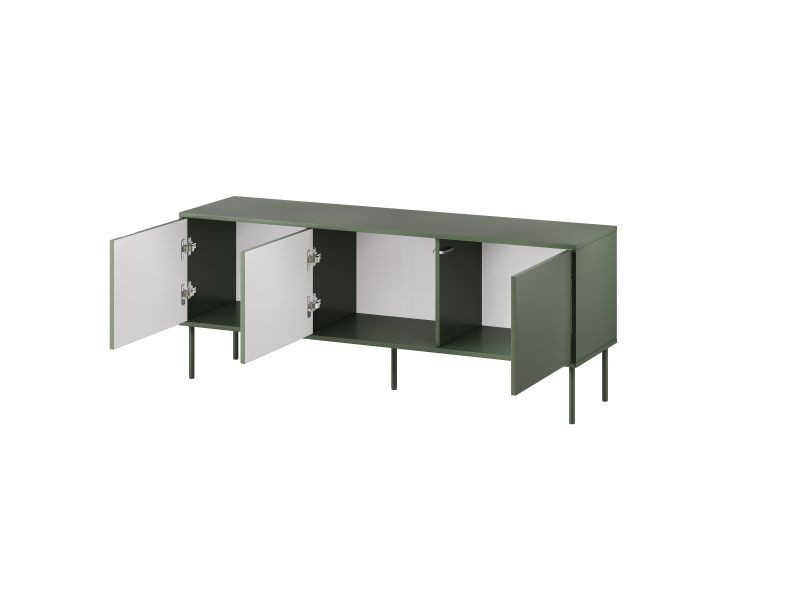 A TRESSE 150 TV komód a modern trendek és a mai háztartások igényeinek figyelembevételével lett tervezve. Tiszta vonalai és elegáns kialakítása könnyen beilleszthető bármilyen belső térbe. A zöld szín természetes és nyugodt hangulatot kölcsönöz otthonának, ami ideális a pihenéshez egy fárasztó nap után.
