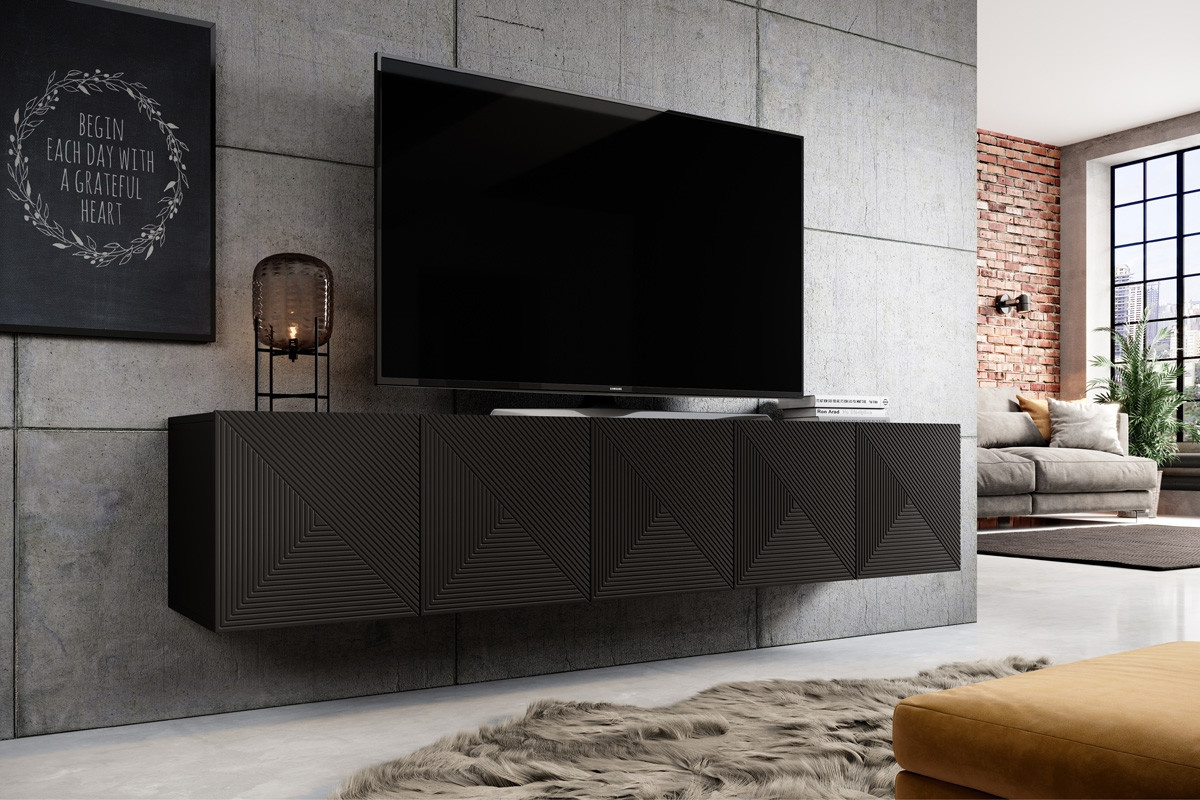 Závěsná TV skříňka 200 cm Asha pětidveřová s drážkovaným čelem - černý mat, Šířka: 200, Výška: 40, Hloubka: 40