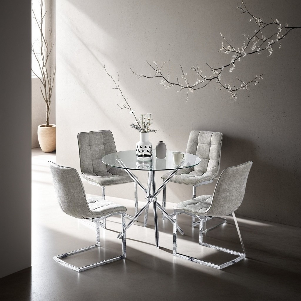 Az Ufo asztal egy minimalista üveg, kerek asztallap és egy krómozott alap eredeti konstrukciójának kombinációja. Egy 90 cm átmérőjű üveglap edzett üvegből készült. A lemez vastagsága 1 cm. Az asztal lábai krómozott fémből készültek. A modern és elegáns asztal dizájn kiegészíti az étkezőt vagy a konyhát modern stílusban. A 90 centiméteres kompakt méret sokoldalú étkezési lehetőségeket biztosít. Könnyen tisztítható asztal jól beválik mind a családi étkezéseknél, mind a kisgyermekekkel való reggelizésnél. Az asztalt elég áttörölni egy tisztítószeres ruhával, hogy visszanyerje hibátlan tisztaságát és fényét. Az asztalláb átmérője 3 cm Az asztal összeszerelést igényel. Az asztal maximális terhelhetősége 50 kg. Az asztal tömege: 13 kg