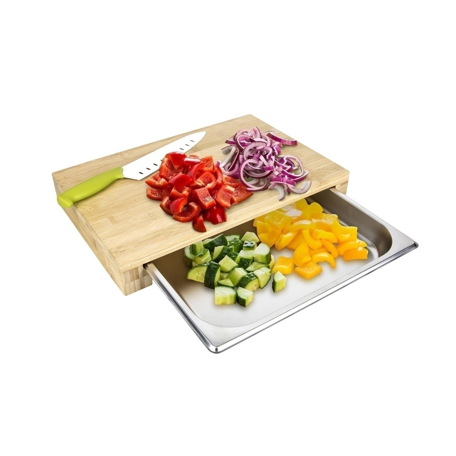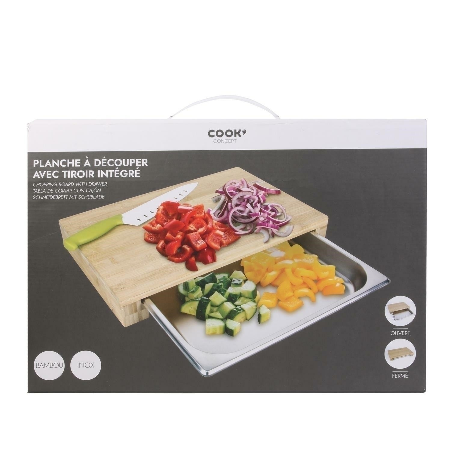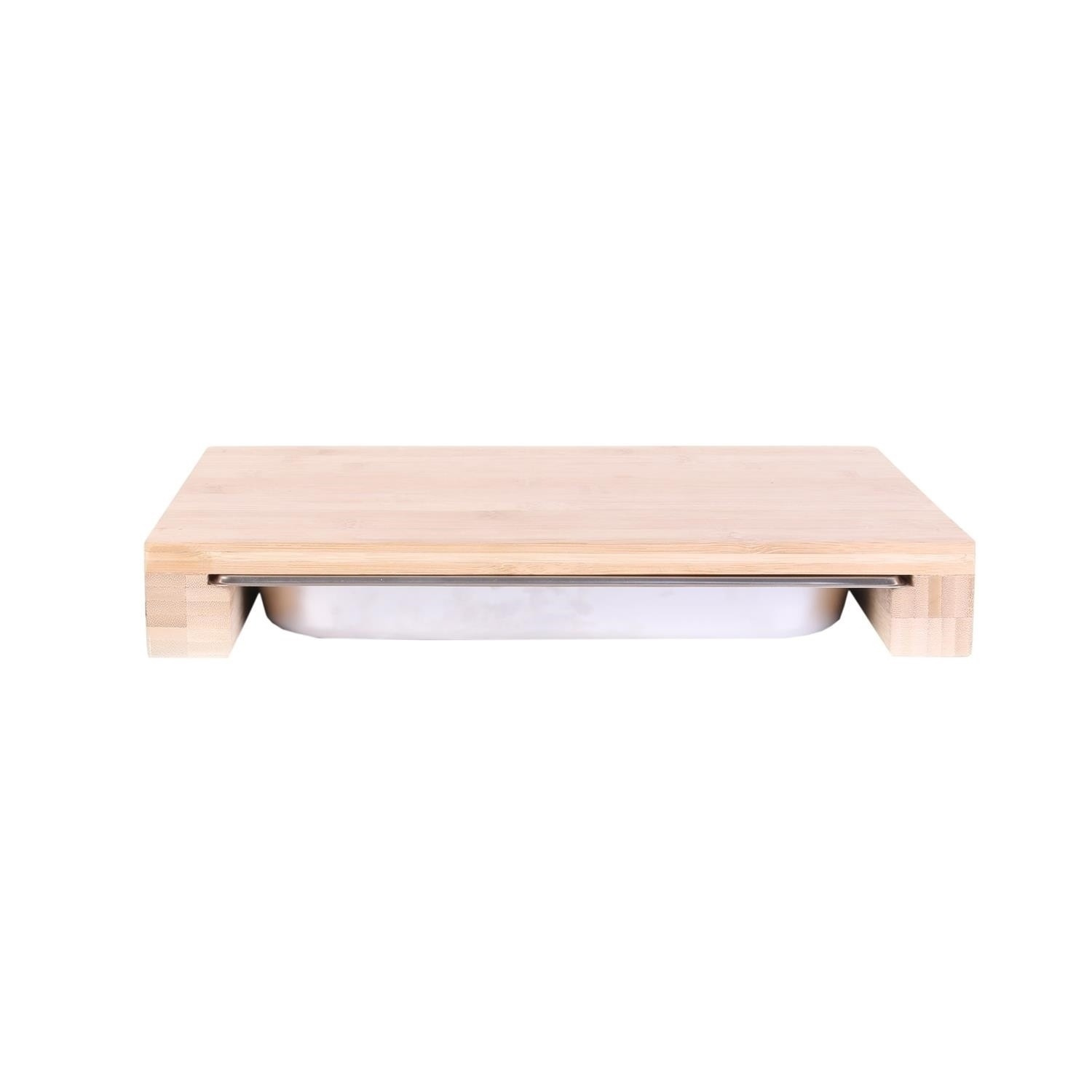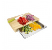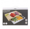 A vágódeszka fiókkal nagyon kényelmes, ergonomikus kombináció. Lehetővé teszi a rend fenntartását a konyhai munka során, és csökkenti a használt edények mennyiségét. A deszka bambuszból készült, míg maga a fiók rozsdamentes acélból. Kartondobozok száma: 1 Kartondobozok méretei: 39,4x32,4x6,5cm
