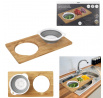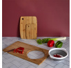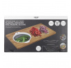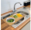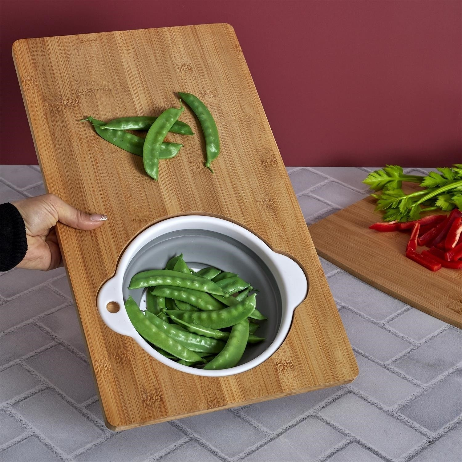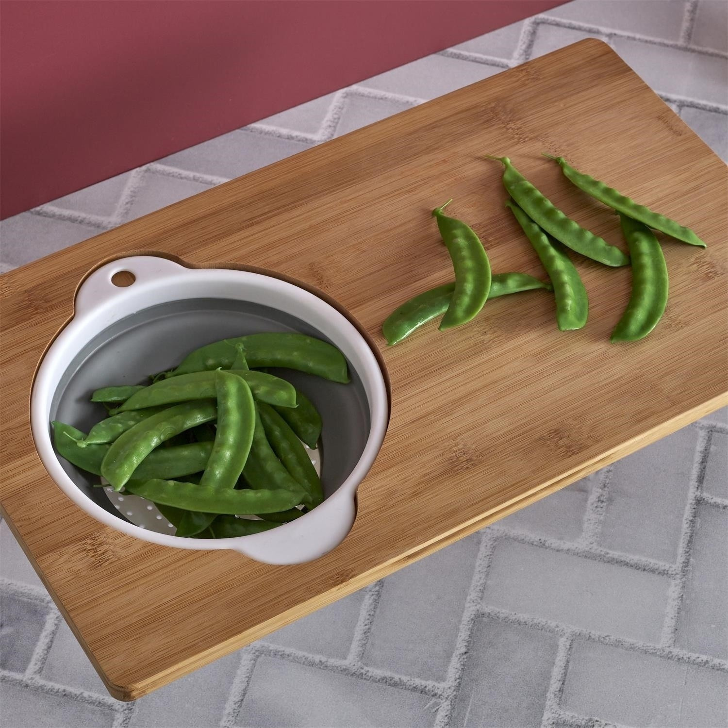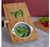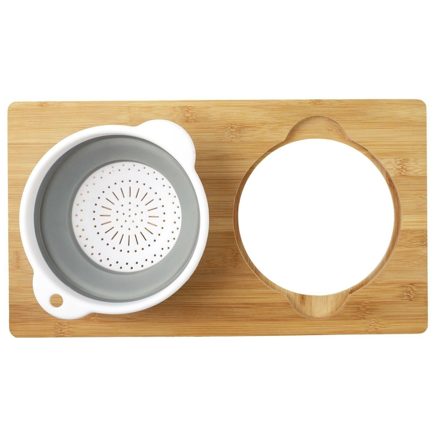 A beépített szűrővel ellátott vágódeszka ideális megoldás lédús gyümölcsök és zöldségek szeletelésére, amelyek sok levet engednek ki. A deszka kiválóan alkalmas mosogatódeszkának, mivel a szűrőn keresztül szivárgó folyadékok azonnal szabadon elfolyhatnak. A deszka bambuszfából készült. A szita belseje műanyagból készült. A szita átmérője 20 cm. A szita 7 cm mély, de össze is hajtható, hogy laposabb legyen. A szita nélküli tábla méretei: 49,5x28x1,5cm Élelmiszerekkel használható Nem használható sütőben Nem használható mikrohullámú sütőben Nem mosható mosogatógépben