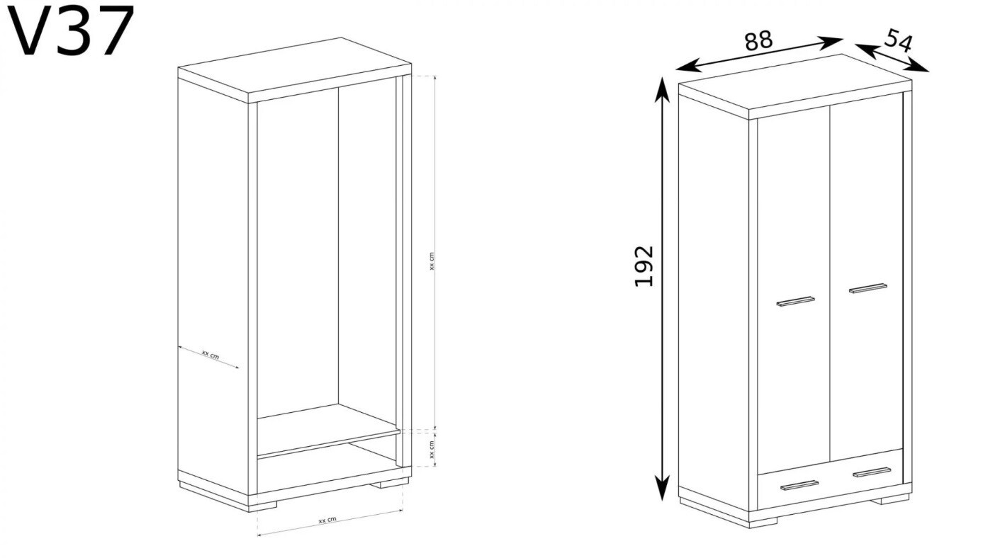 Kétszárnyú ruhásszekrény a Vegas kollekcióból. Van középen egy rúd, amely lehetővé teszi a bútor szabad terének kitöltését. Alatta található egy fiók, amely sok ruhát, dokumentumot vagy más kiegészítőt képes befogadni. A fém fogantyúk beleolvadnak a bútor egészébe, és tökéletesen kiemelik annak határozott jellegét. Alkalmas a nappaliba, hálószobába és dolgozószobába is.
