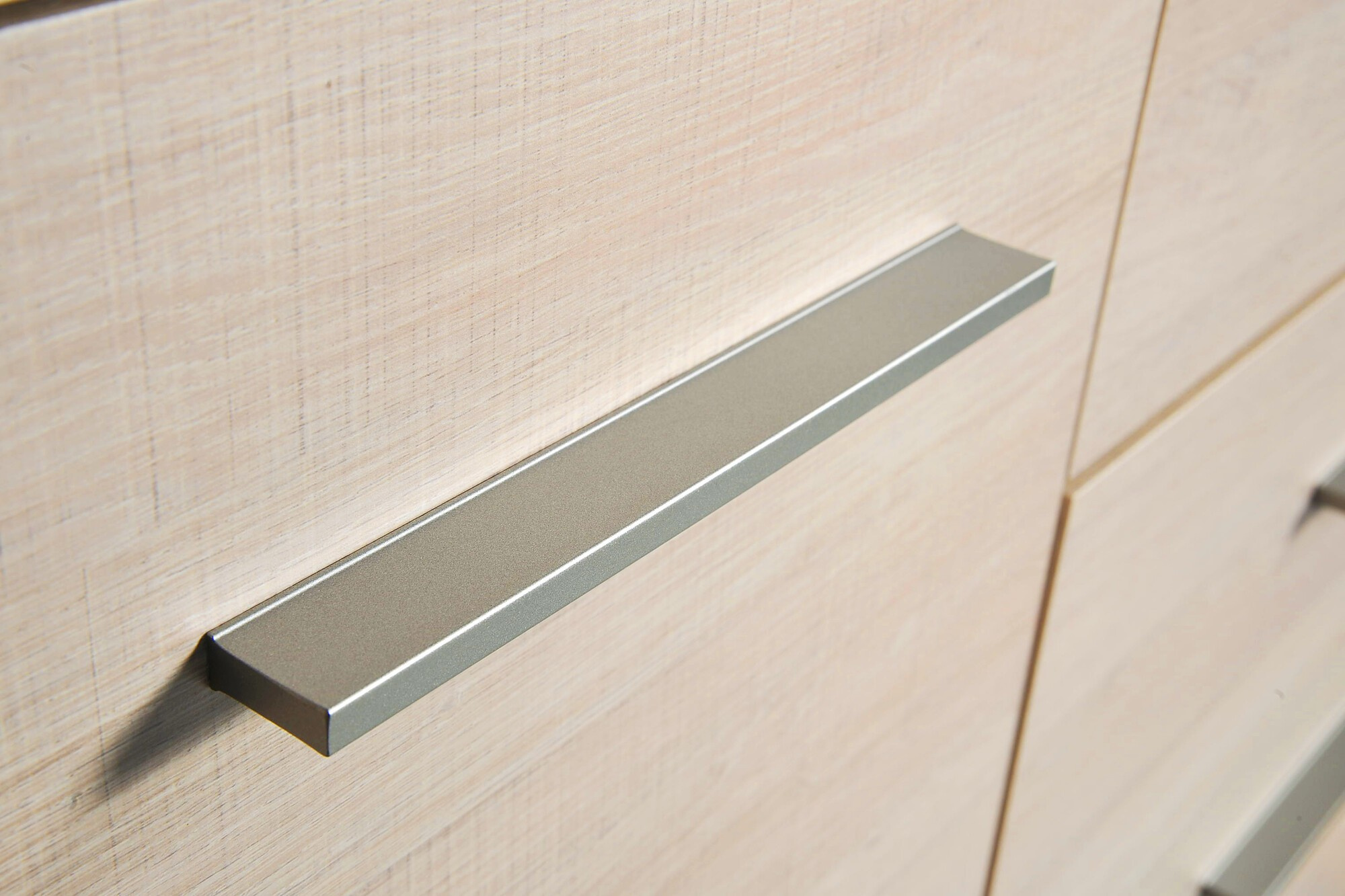 Két tágas fiókkal rendelkezik, ideális ruhák vagy dokumentumok tárolására. Alattuk két ajtó található, mögöttük egy válaszfal és egy polc, ami lehetővé teszi a nagy mennyiségű dolgok jó szervezését és kezelését. A fém fogantyúk kiemelik a bútor egyediségét, illenek a nappaliba és az irodába is, sokféle elrendezést hozhat létre velük.