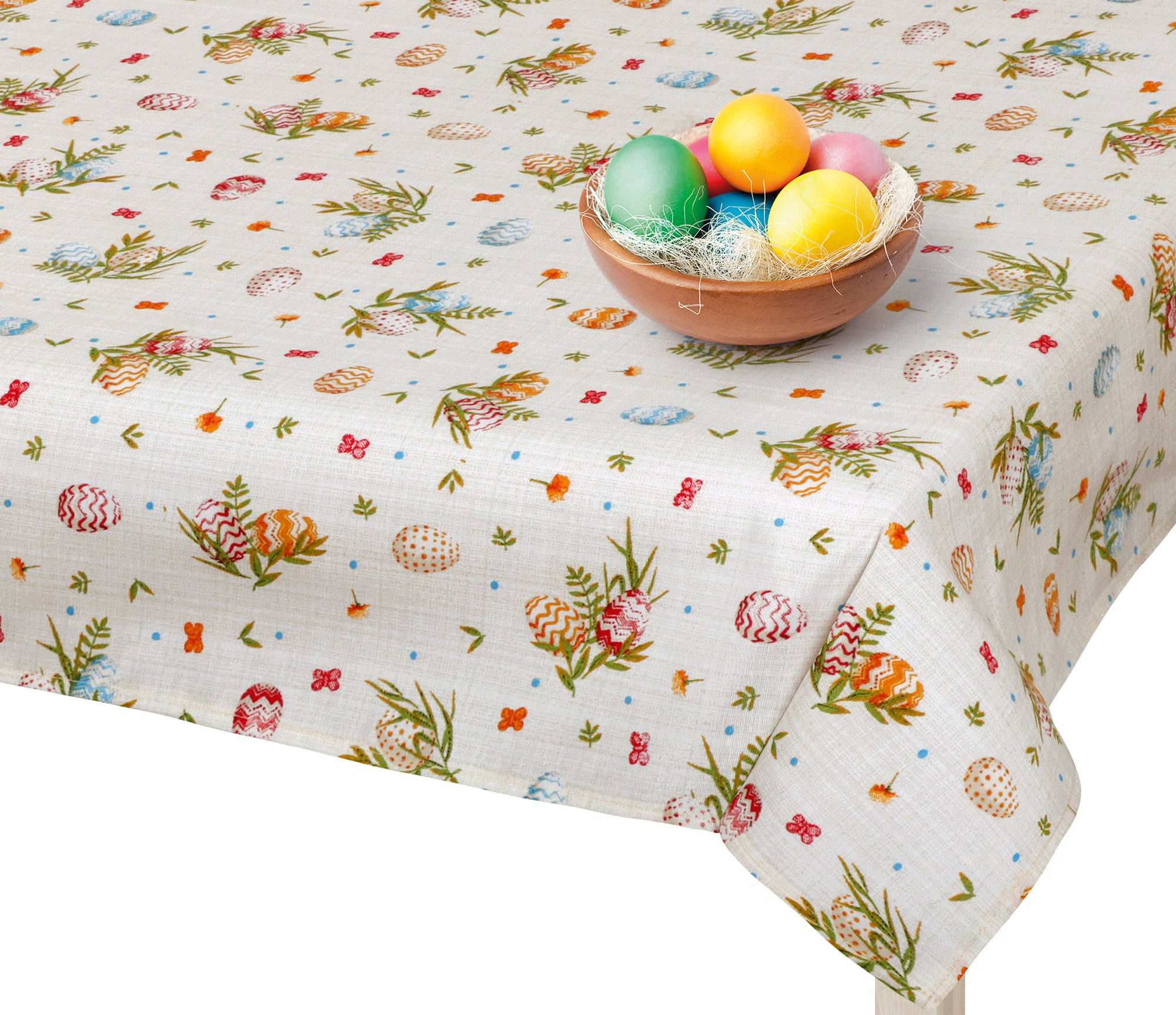 Tento ubrus s velikonočním motivem je ušit z kvalitního materiálu, který se odolný vůči poškození. Na Vašem stole bude skvěle vynikat a stane se oblíbeným doplňkem jarních svátků nejen ve Vaší kuchyni. Ve stejném designu je možné objednat i kuchyňskou chňapku nebo povláček na polštářek.