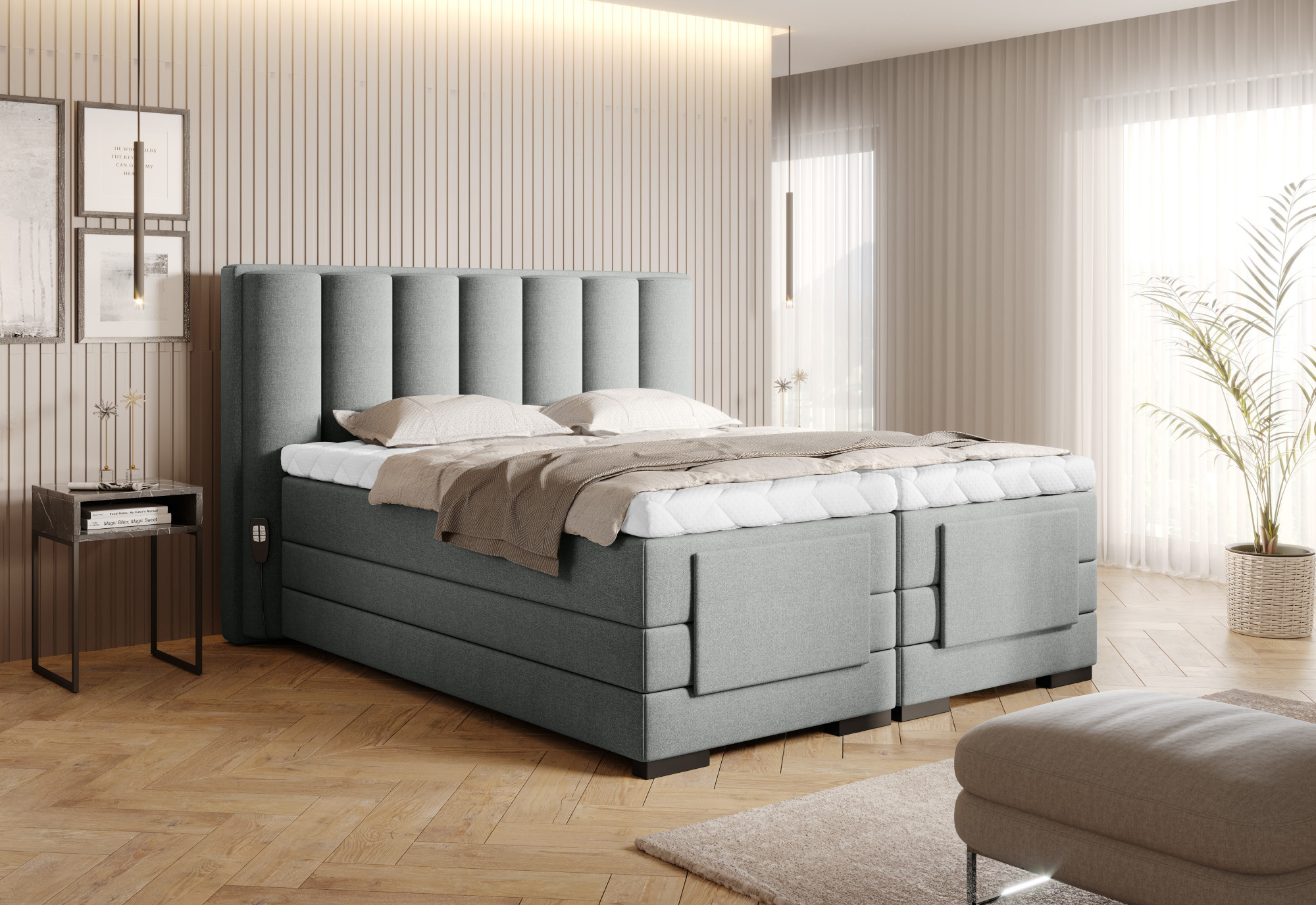 The Veros adjustable electric bed allows you to control the comfort of your rest in order to ensure a comfortable and serene sleep. It has a motorised, adjustable frame that allows the user to easily adjust the footrest and headrest parts. You do not even need to get up from the bed to change its position as the kit includes two remote controls. In the case of a single bed, one remote control is included. The Veros bed consists of as many as 2 main mattresses: bonnell and pocket, and a mattress topper. The main mattresses provide the utmost cosiness and comfort that a continental bed can provide. The mattress topper, in turn, perfectly protects the main mattresses against dirt or damage. The advantages of mattress toppers also include the fact that they provide additional softness and support during sleep, and extend the life of the main mattress. The mattress topper of the Veros continental bed is secured with a removable Silk cover that can be machine-washed. The Veros electric bed also looks fantastic and is a great addition to any bedroom. The upholstered back allows you to put this bed in the middle of the room, making it its centrepiece. The black colour of the legs is universal, easily fitting into many different bedroom layouts. Another advantage that allows you to choose the perfect Veros bed for your bedroom is the fact that they are available in as many as 4 sizes: 90/140/160/180 x 200 cm.