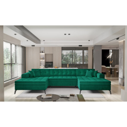 Vertizo is a modern, large litra, U shaped corner sofa that will be a highlight of any living room. Its simple elegant line will be perfect for both modern and classic interiors. Thanks to its high metal leg, it acquires slenderness and lightness and does not overwhelm with its size. Thanks to the use of two foams T3040 and T2542, it is extremely comfortable and convenient. In addition, two ottomans will provide excellent rest for the whole family. The dimensions of the corner sofa, 350*170*93 cm, will provide rest and comfort and thanks to them we gain a large sleeping area of 295*110 cm. Dolphin-type unfolding allows you to easily and quickly unfold the corner sofa, which we turn into a spacious bed with one hand movement. The Vertizo corner sofa is designed to fit in with current trends, and at the same time it is durable, has a solid construction and comfortable to use. Elegant quilting throughout the furniture adds a chic touch, and the black leg will fit perfectly into any interior. Vertizo corner sofa is available in a wide range of fabrics and colors. We are confident that Vertizo will satisfy the most demanding tastes.