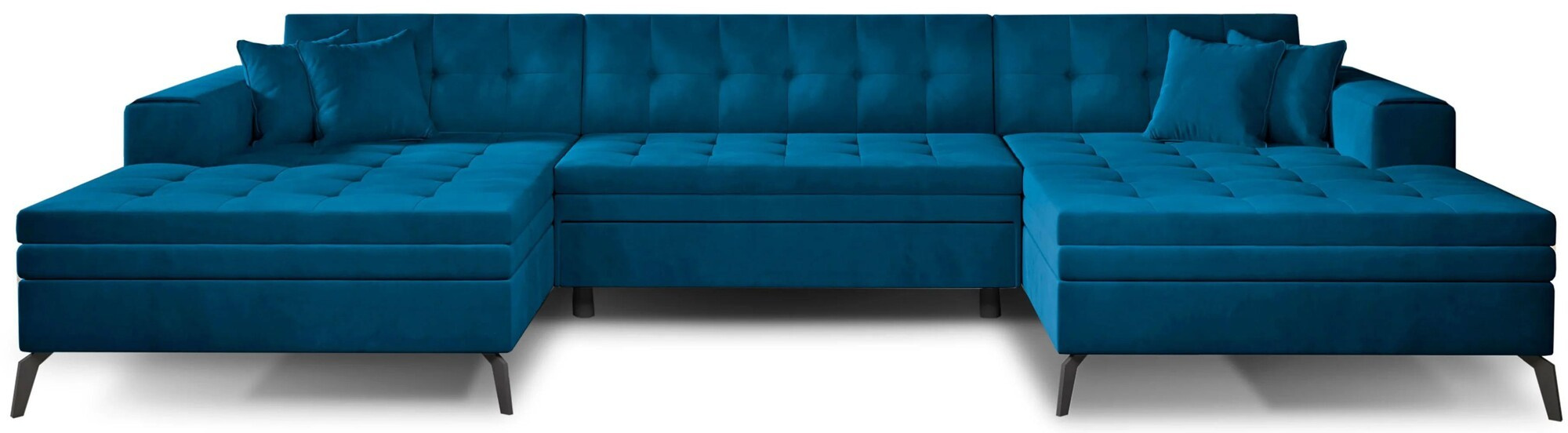 Vertizo is a modern, large litra, U shaped corner sofa that will be a highlight of any living room. Its simple elegant line will be perfect for both modern and classic interiors. Thanks to its high metal leg, it acquires slenderness and lightness and does not overwhelm with its size. Thanks to the use of two foams T3040 and T2542, it is extremely comfortable and convenient. In addition, two ottomans will provide excellent rest for the whole family. The dimensions of the corner sofa, 350*170*93 cm, will provide rest and comfort and thanks to them we gain a large sleeping area of 295*110 cm. Dolphin-type unfolding allows you to easily and quickly unfold the corner sofa, which we turn into a spacious bed with one hand movement. The Vertizo corner sofa is designed to fit in with current trends, and at the same time it is durable, has a solid construction and comfortable to use. Elegant quilting throughout the furniture adds a chic touch, and the black leg will fit perfectly into any interior. Vertizo corner sofa is available in a wide range of fabrics and colors. We are confident that Vertizo will satisfy the most demanding tastes.
