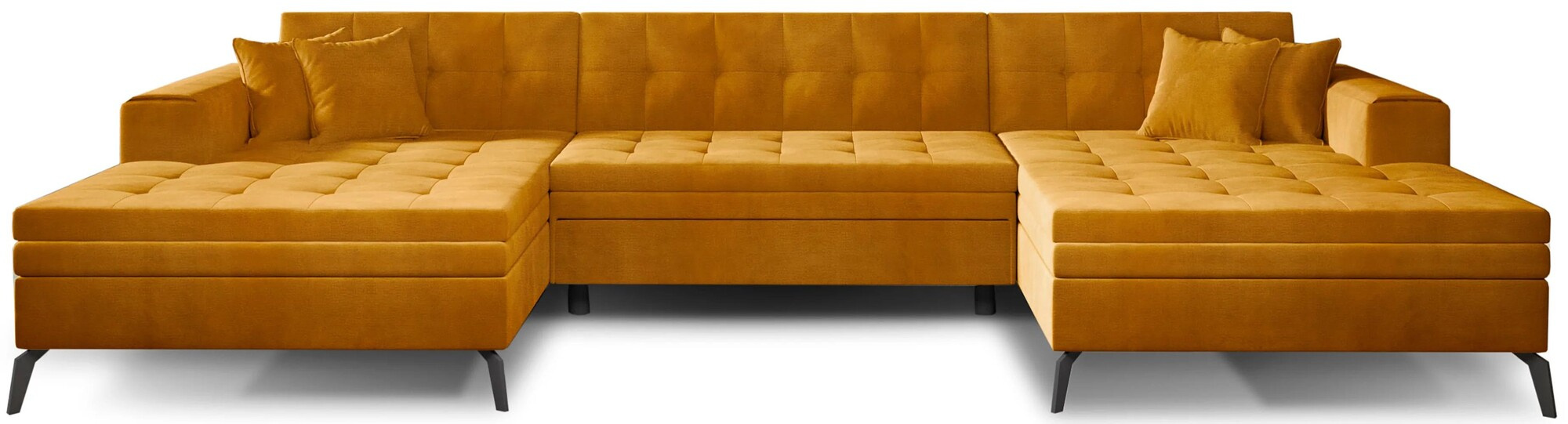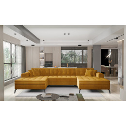 Vertizo is a modern, large litra, U shaped corner sofa that will be a highlight of any living room. Its simple elegant line will be perfect for both modern and classic interiors. Thanks to its high metal leg, it acquires slenderness and lightness and does not overwhelm with its size. Thanks to the use of two foams T3040 and T2542, it is extremely comfortable and convenient. In addition, two ottomans will provide excellent rest for the whole family. The dimensions of the corner sofa, 350*170*93 cm, will provide rest and comfort and thanks to them we gain a large sleeping area of 295*110 cm. Dolphin-type unfolding allows you to easily and quickly unfold the corner sofa, which we turn into a spacious bed with one hand movement. The Vertizo corner sofa is designed to fit in with current trends, and at the same time it is durable, has a solid construction and comfortable to use. Elegant quilting throughout the furniture adds a chic touch, and the black leg will fit perfectly into any interior. Vertizo corner sofa is available in a wide range of fabrics and colors. We are confident that Vertizo will satisfy the most demanding tastes.