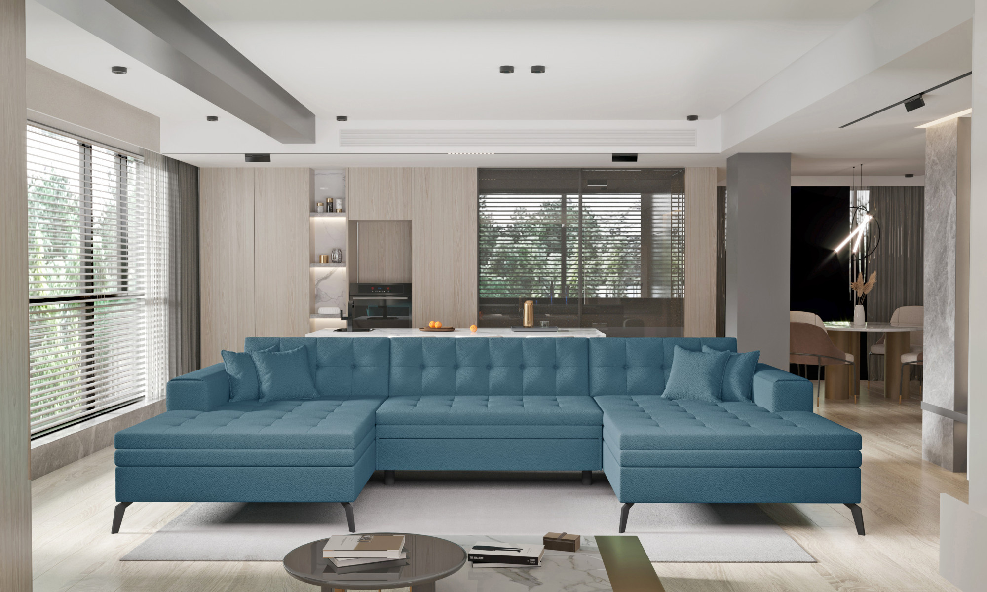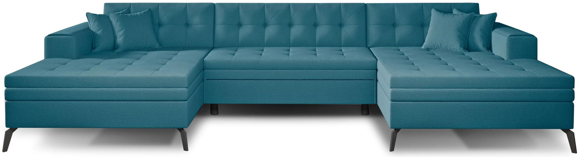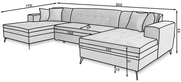 Vertizo is a modern, large litra, U shaped corner sofa that will be a highlight of any living room. Its simple elegant line will be perfect for both modern and classic interiors. Thanks to its high metal leg, it acquires slenderness and lightness and does not overwhelm with its size. Thanks to the use of two foams T3040 and T2542, it is extremely comfortable and convenient. In addition, two ottomans will provide excellent rest for the whole family. The dimensions of the corner sofa, 350*170*93 cm, will provide rest and comfort and thanks to them we gain a large sleeping area of 295*110 cm. Dolphin-type unfolding allows you to easily and quickly unfold the corner sofa, which we turn into a spacious bed with one hand movement. The Vertizo corner sofa is designed to fit in with current trends, and at the same time it is durable, has a solid construction and comfortable to use. Elegant quilting throughout the furniture adds a chic touch, and the black leg will fit perfectly into any interior. Vertizo corner sofa is available in a wide range of fabrics and colors. We are confident that Vertizo will satisfy the most demanding tastes.