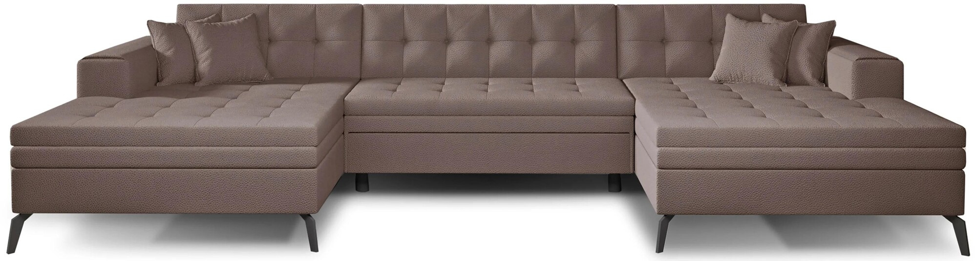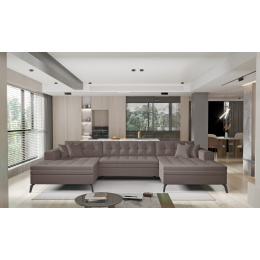 Vertizo is a modern, large litra, U shaped corner sofa that will be a highlight of any living room. Its simple elegant line will be perfect for both modern and classic interiors. Thanks to its high metal leg, it acquires slenderness and lightness and does not overwhelm with its size. Thanks to the use of two foams T3040 and T2542, it is extremely comfortable and convenient. In addition, two ottomans will provide excellent rest for the whole family. The dimensions of the corner sofa, 350*170*93 cm, will provide rest and comfort and thanks to them we gain a large sleeping area of 295*110 cm. Dolphin-type unfolding allows you to easily and quickly unfold the corner sofa, which we turn into a spacious bed with one hand movement. The Vertizo corner sofa is designed to fit in with current trends, and at the same time it is durable, has a solid construction and comfortable to use. Elegant quilting throughout the furniture adds a chic touch, and the black leg will fit perfectly into any interior. Vertizo corner sofa is available in a wide range of fabrics and colors. We are confident that Vertizo will satisfy the most demanding tastes.