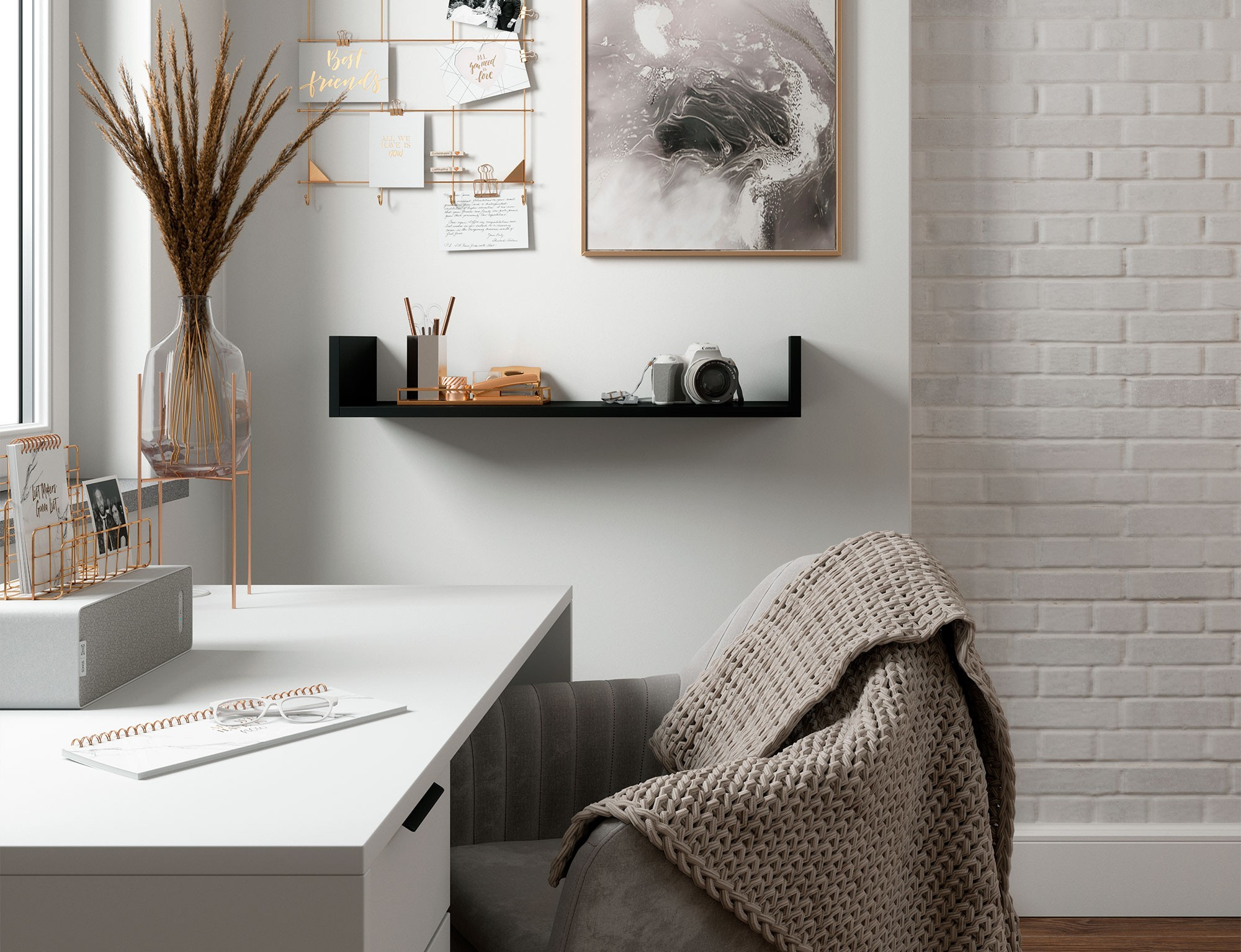 The Vissta wall-mounted shelf is the perfect solution for those who appreciate modern, minimalist design that blends seamlessly with Scandinavian-style interiors. Vissta is a versatile decorative element that fits perfectly in the living room, bedroom, or office. It features a simple yet modern form that beautifully showcases your favorite decorations, books, or photographs. Thanks to its minimalist construction, the shelf doesn't overwhelm the interior but subtly complements it, giving the space an elegant appearance. The shelf is made from high-quality 16 mm laminated chipboard, ensuring durability and resistance to everyday use. The front of the shelf is finished with PVC edging in a color that matches the decor, giving it a uniform and aesthetic look.