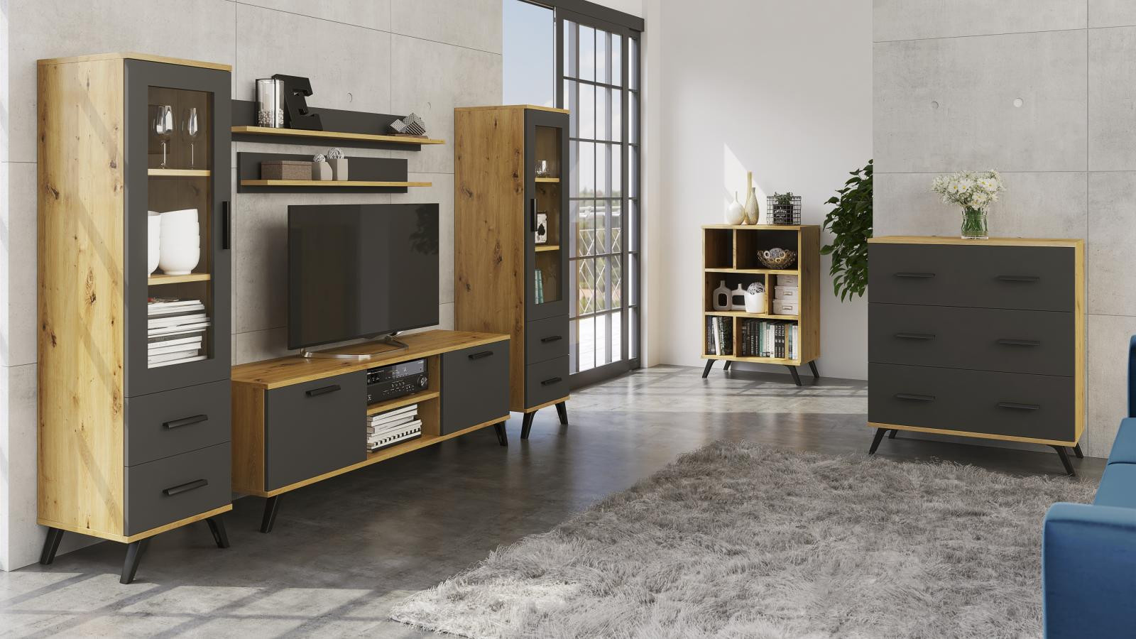 Skříň Roky 6 Grafit je vyrobena z lamina v krásném dekoru grafit a dub artisan. Lamino tloušťky 18 mm je odolné a je zakončeno lištou ABS. Skříň pojme vše potřebné, má prosklená dvířka, za kterými jsou dvě police z lamina a ve spodní části jsou také dva šuplíky. Rukojeti v dekóru dřeva jsou vyrobeny z plastu. Jistě oceníte i snadnou údržbu. Skříň je dodávána v demontu. Součástí balení je montážní návod včetně všech spojovacích prvků.