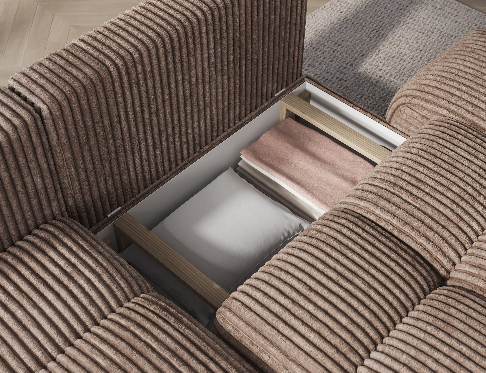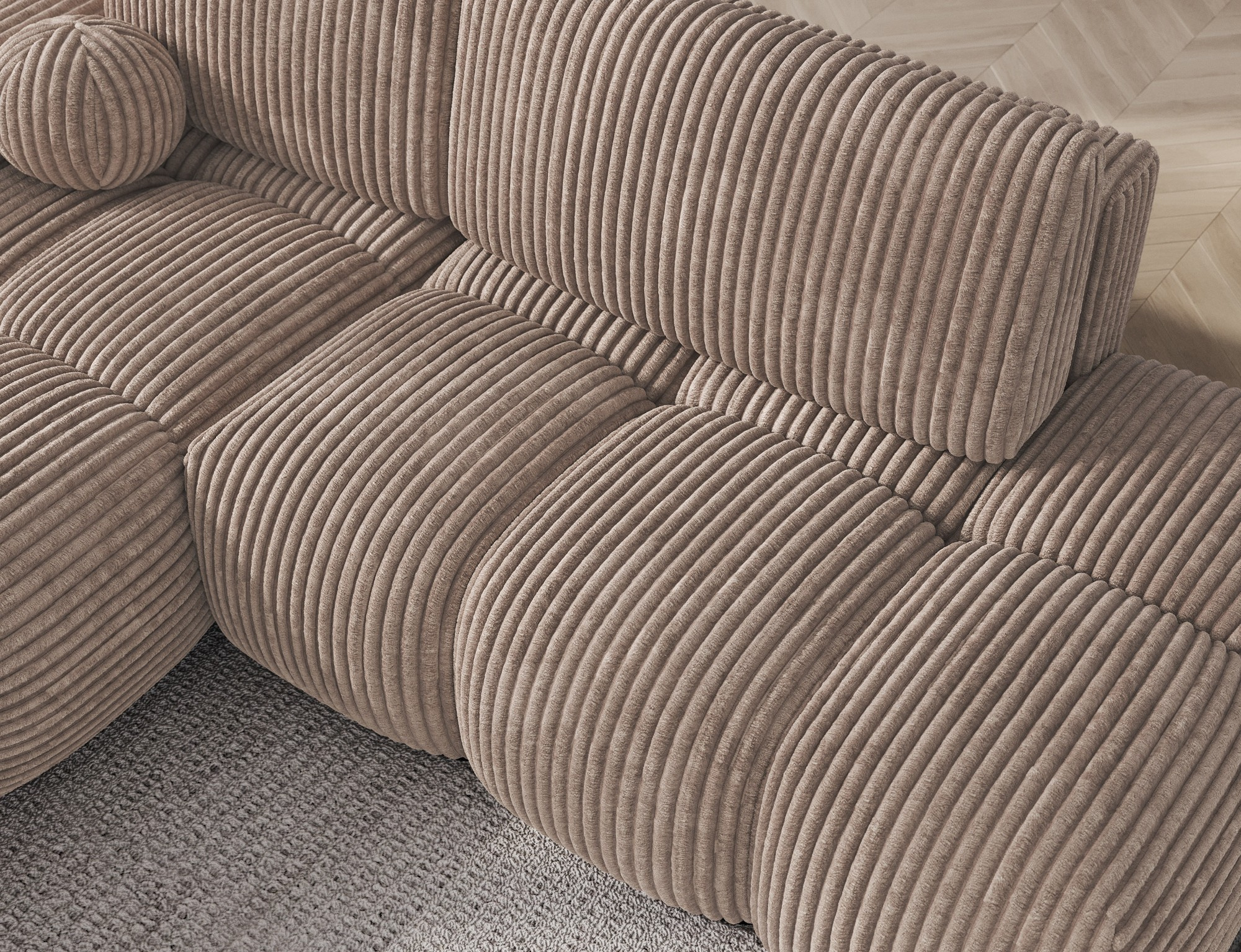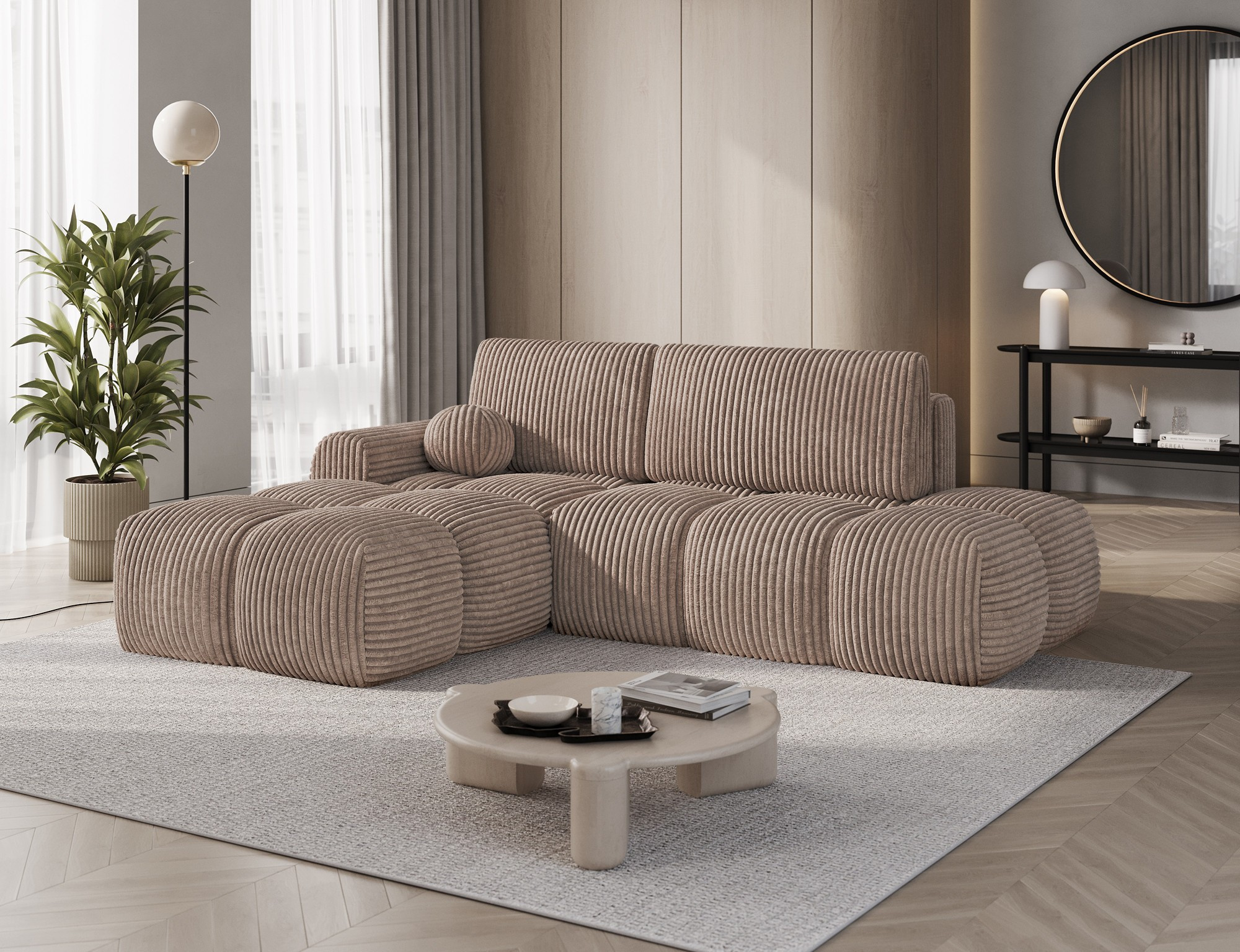 The Vittario corner sofa is a modern and functional piece of furniture designed for maximum comfort. Its cubic shape and soft lines blend perfectly with contemporary interior designs. The piece measures 227 × 170 × 95 cm and weighs 115.4 kg, ensuring stability and long-lasting durability. The seat is filled with a Type B wave spring, HR3030 foam, and T2315 foam. The backrest consists of cushions filled with foam granulate, which adapt to the body and provide soft, relaxing comfort. The sofa is equipped with a sleeping function offering a surface of 95 × 205 cm, as well as a DL mechanism with a spring that supports easy and quick unfolding. An additional advantage is the bedding storage, which helps keep the living room tidy. Vittario is a combination of practicality, aesthetics, and comfort, perfect for modern spaces.
