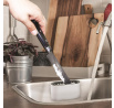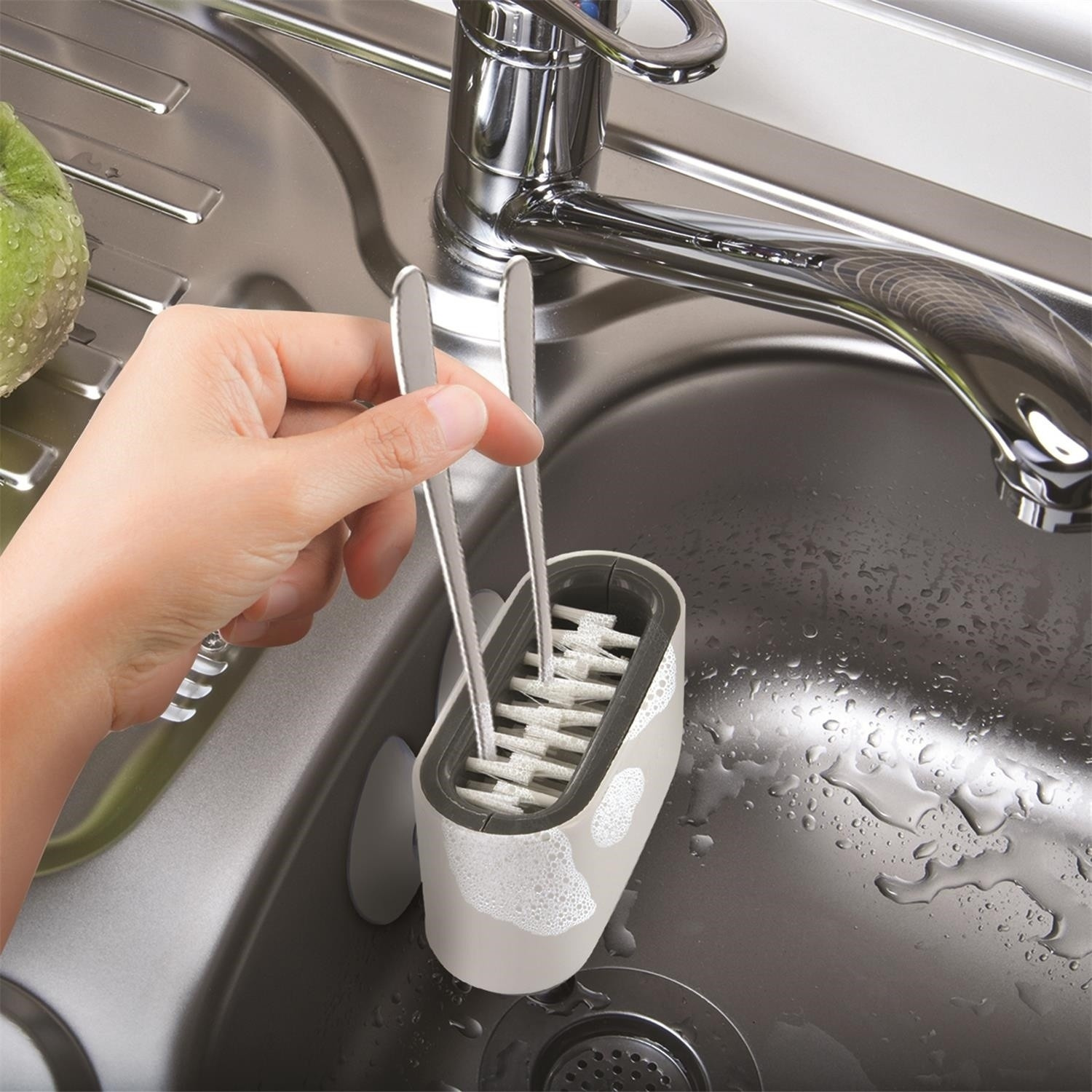Az evőeszköz tisztító kefe könnyen tisztítható műanyagból készült. A kefére szerelt tapadókorongok kényelmet biztosítanak a használat során. A kefe beválik a különleges evőeszközkészlet kézi mosásánál, amelyet nem szeretnénk mosogatógépben mosni a sérülés veszélye miatt.