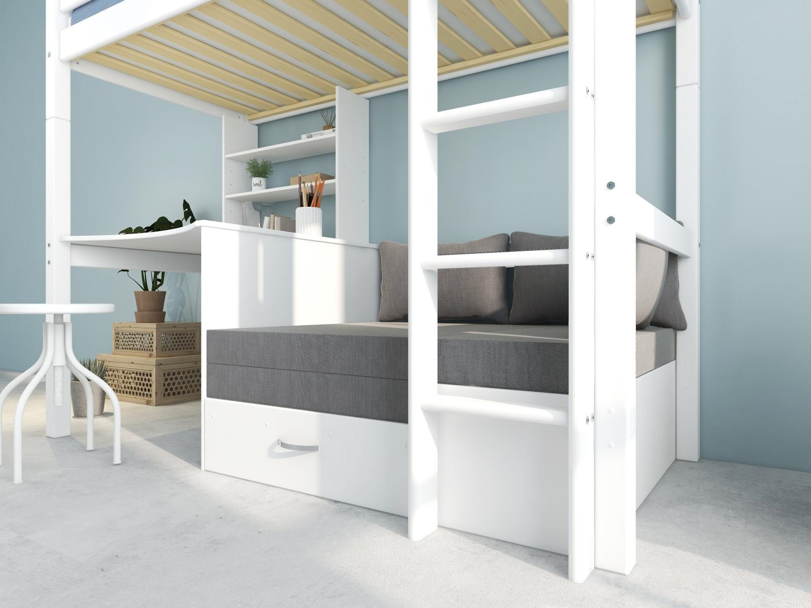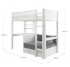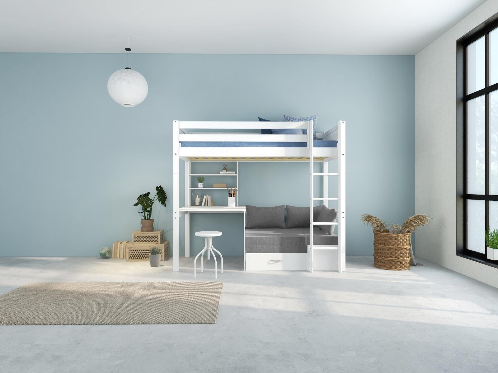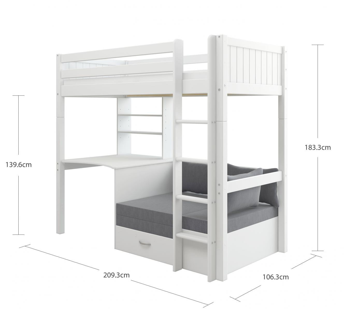 Vysoká postel s psacím stolem a rozkládací pohovkou je fantastickým řešením pro efektivní využití prostoru v pokoji vašeho teenagera. Pod postelí získáte nejen dostatek místa ke studiu či jiné kreativní činnosti, ale také útulnou pohovku pro posezení s přáteli - kterou lze rozložit na postel pro hosty.