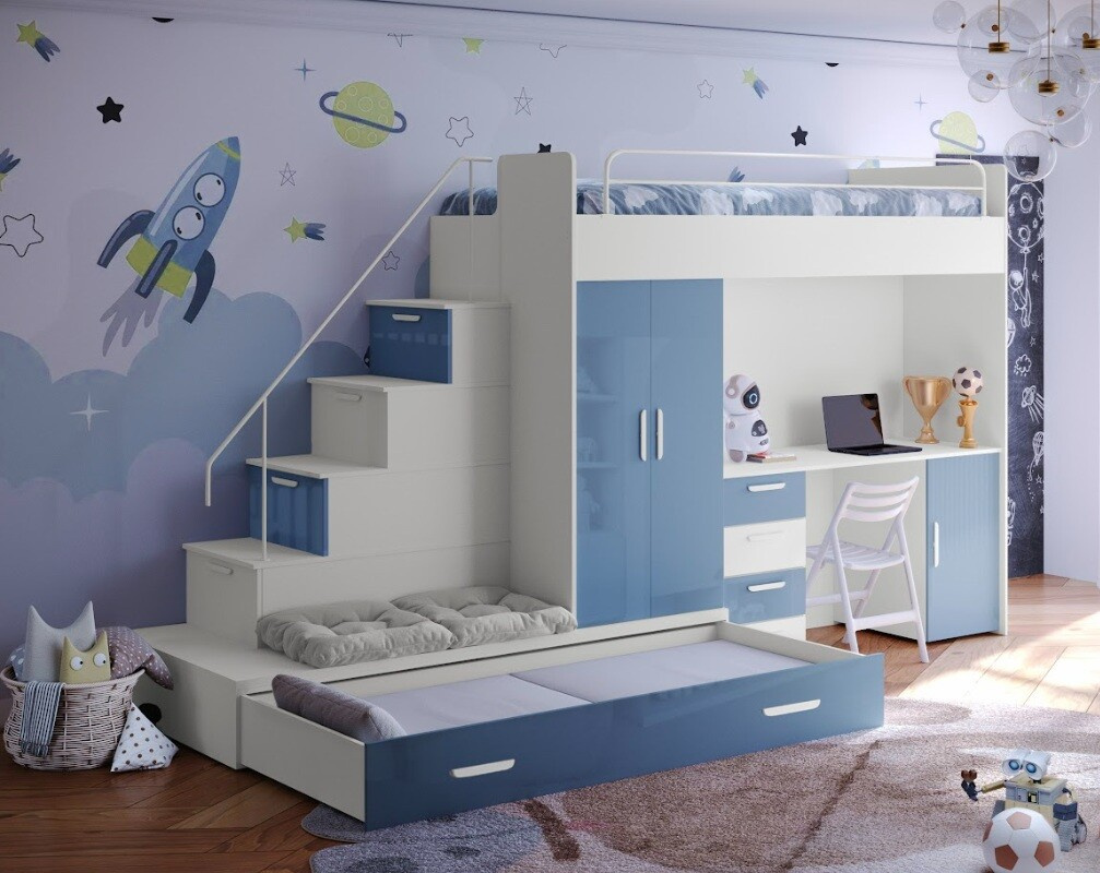 Tato postel je určená především pro osoby, které ocení moderní design, funkčnost a spoustu úložných prostorů. Patentované provedení a stabilní konstrukce postele Vám zaručuje bezpečí pro Vaše děti. Schody v sobě ukrývají spoustu úložného prostoru. Barevné provedení dvířek je v lesku a schůdky lze objednat jak na pravou tak i levou stranu (stranu schodů určujeme z čelního pohledu). Nosnost lůžka je 100 kg, nosnost schodu je 55 kg. Pod postelí se nachází psací stůl se šuplíky i šatní skříň včetně velkého výsuvného úložného šuplíku. K této posteli je možnost dokoupit další nábytek a utvořit tak krásný dětský pokoj. Uvedená úvodní fotografie je v Levém provedení.