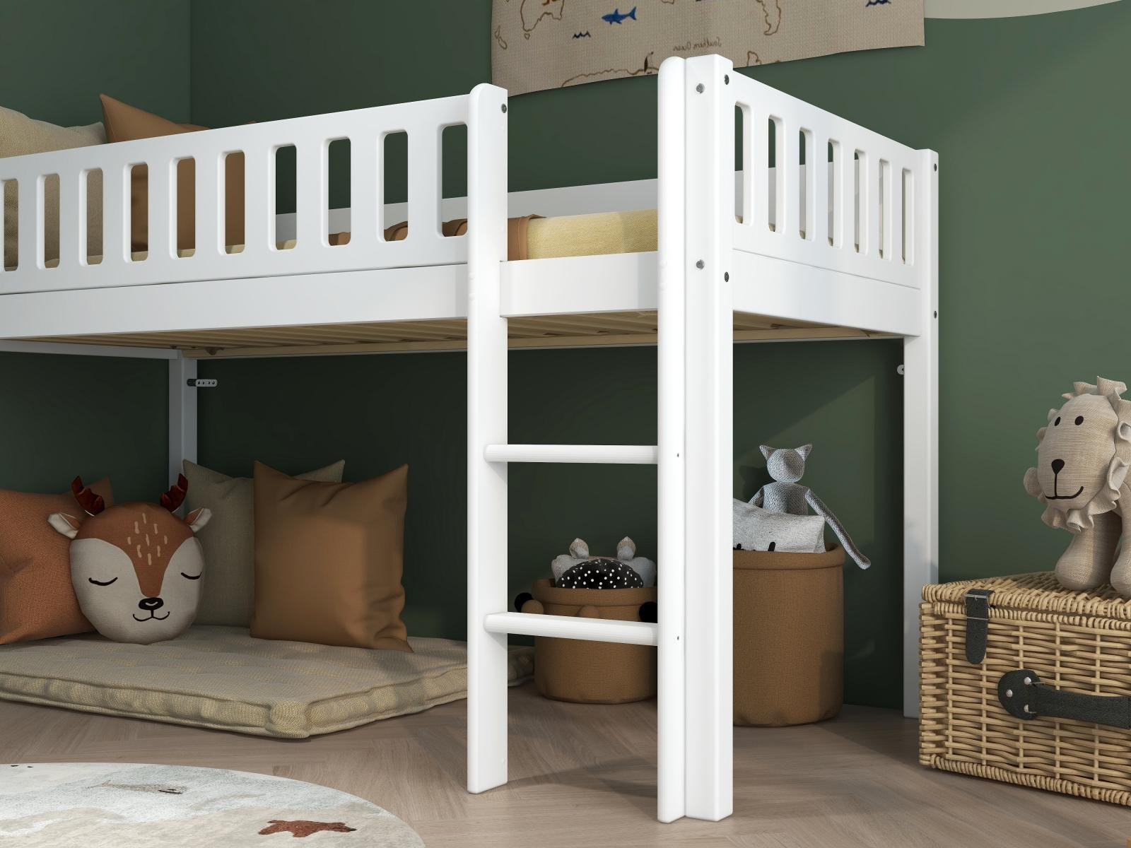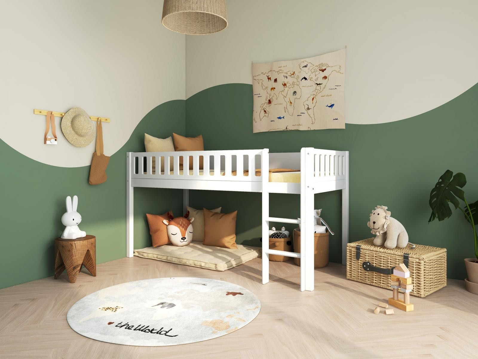 Vyvýšená postel Viggo je dokonalou volbou pro děti, které rády šplhají po žebříku. Praktický a útulný prostor pod postelí vytvoří skvělé místo pro hraní nebo uložení všech nezbytností.