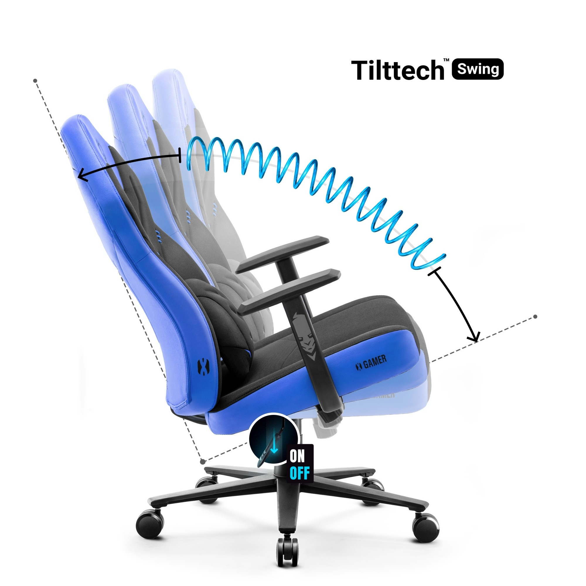 A megfelelő magasság beállítása kulcsfontosságú a helyes testtartás fenntartásához és a hátfájás megelőzéséhez. A rendszer továbbá fel van szerelve a Tilttech™ Swing funkcióval, amely lehetővé teszi a pihentető hintázást. Így pihenhet és lazíthat a játékok közötti szünetekben.Tökéletes rugózás: Kényelem még intenzív játék közben is