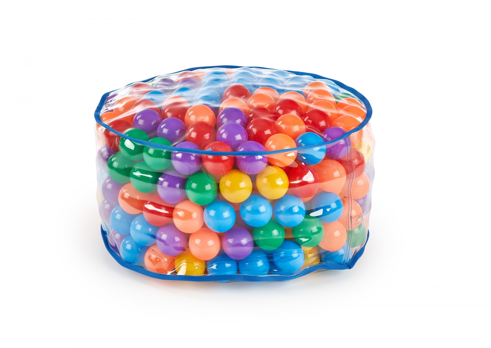 méretek: fi65/36 cm, anyag: tanúsított, nem mérgező, szagtalan műanyag, szín: golyók - többszínű, huzat - színtelen kék szalagokkal