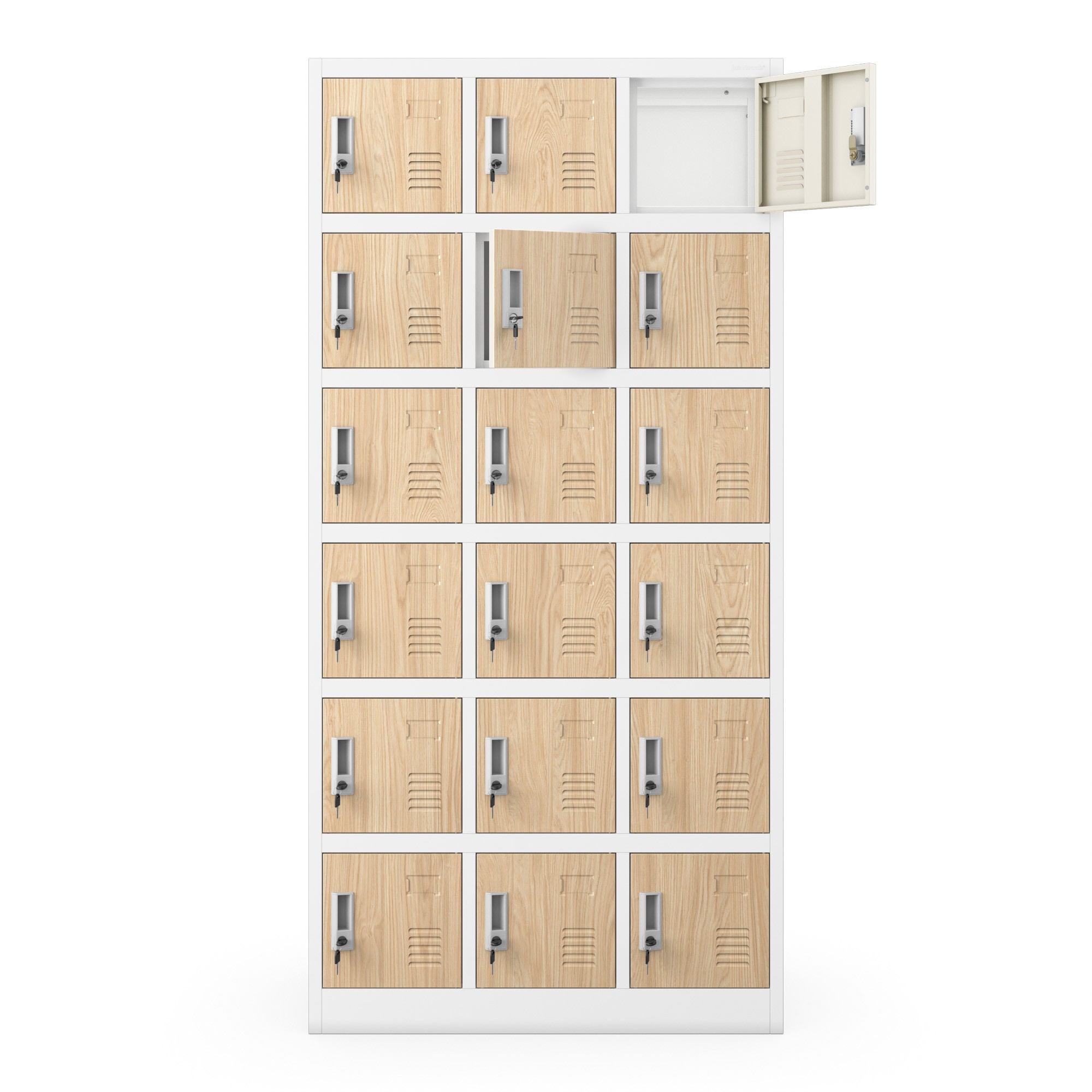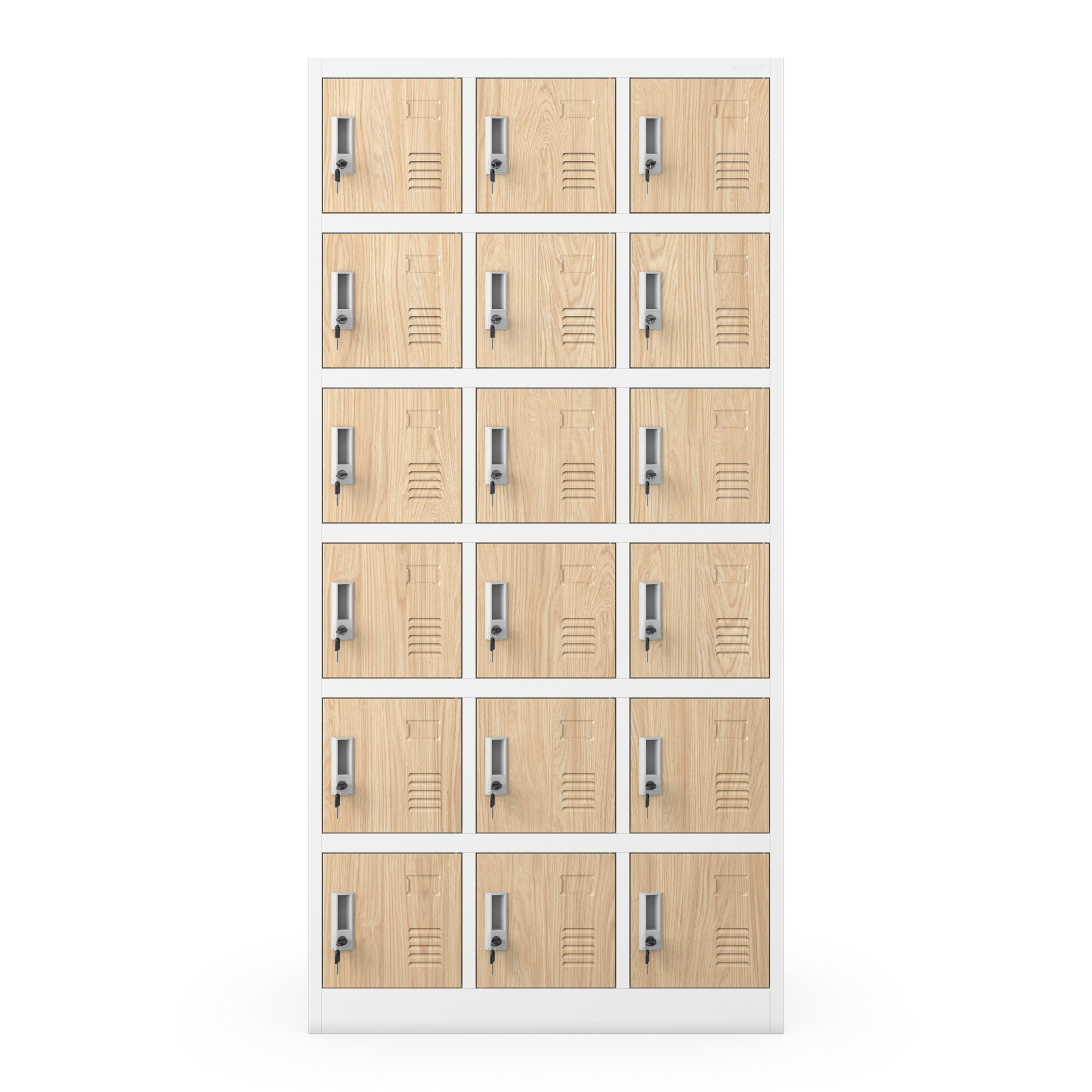 A KAROL szekrény 18 különálló rekesszel rendelkezik, amelyek elegendő helyet biztosítanak ruhák, cipők, hátizsákok, táskák és személyes tárgyak tárolására. Minden rekesz úgy van kialakítva, hogy maximalizálja a rendelkezésre álló tér kihasználását. Ennek köszönhetően a KAROL szekrény ideálisak korlátozott hellyel rendelkező gardróbokba, ahol több ember holmiját kell hatékonyan elrendezni.