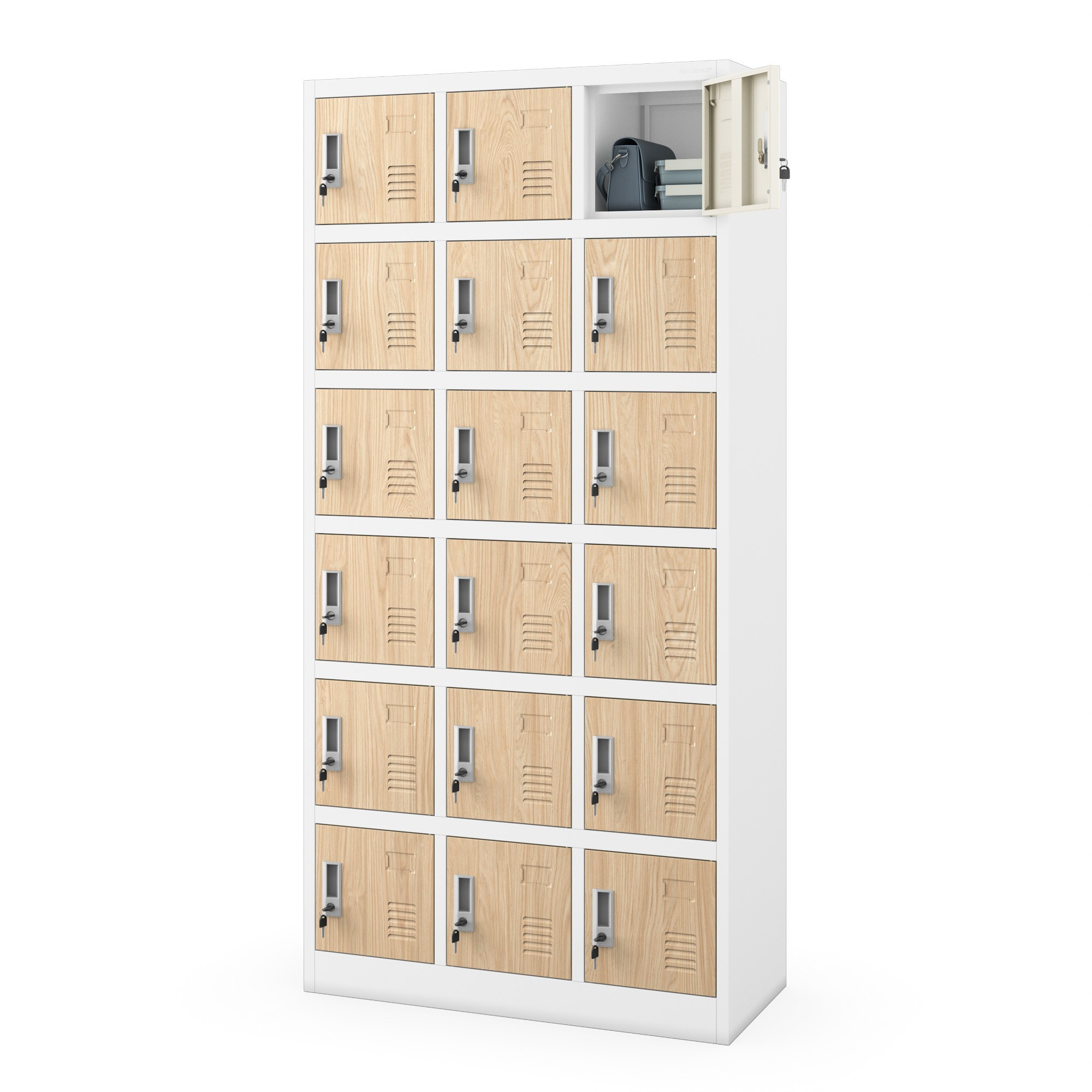 18 különálló rekesz lehetővé teszi ruhák, cipők, hátizsákok és személyes tárgyak tárolását. Ez a struktúra biztosítja a rendelkezésre álló hely hatékony kihasználását és több ember kényelmes használatát. A szervezet sokkal hatékonyabbá válik.