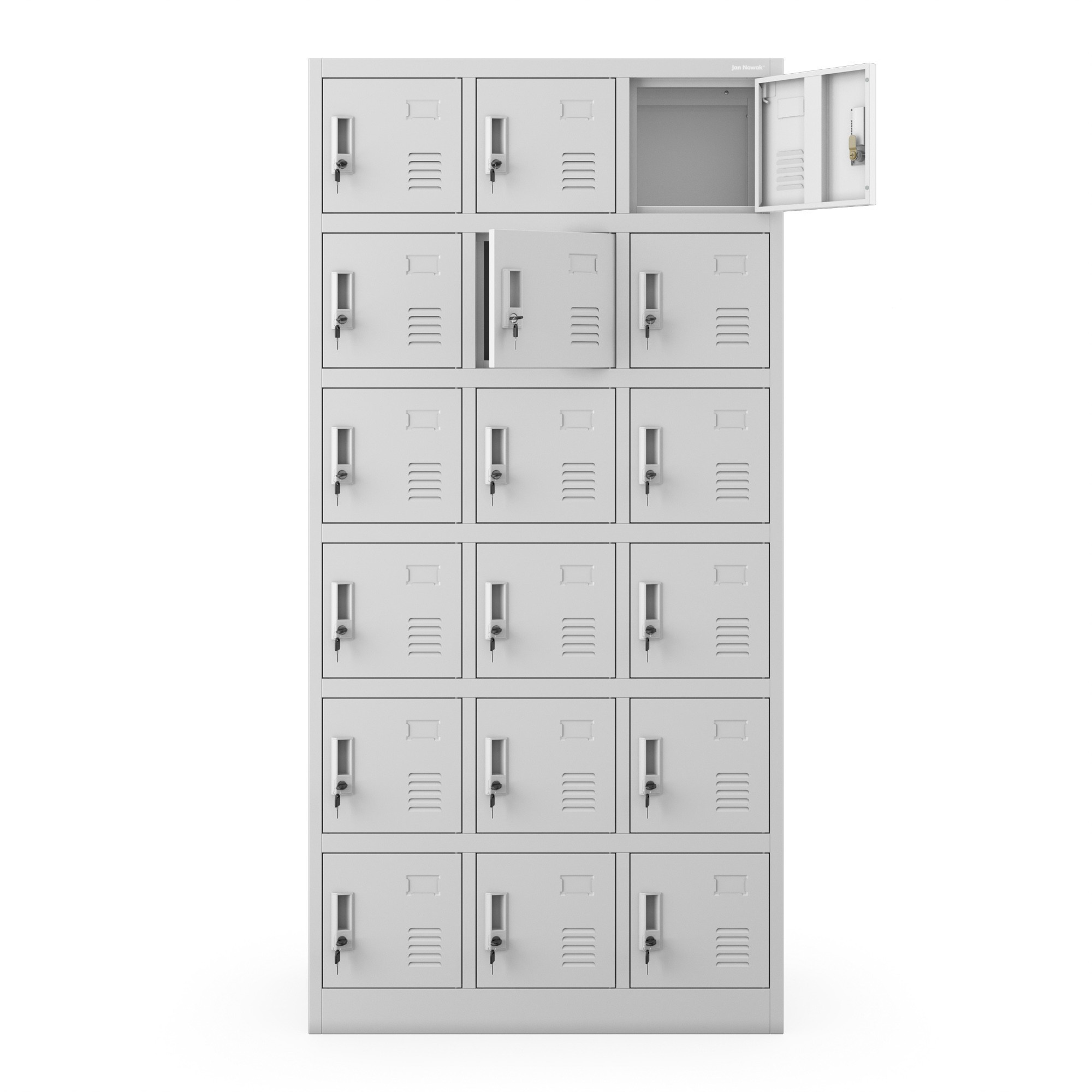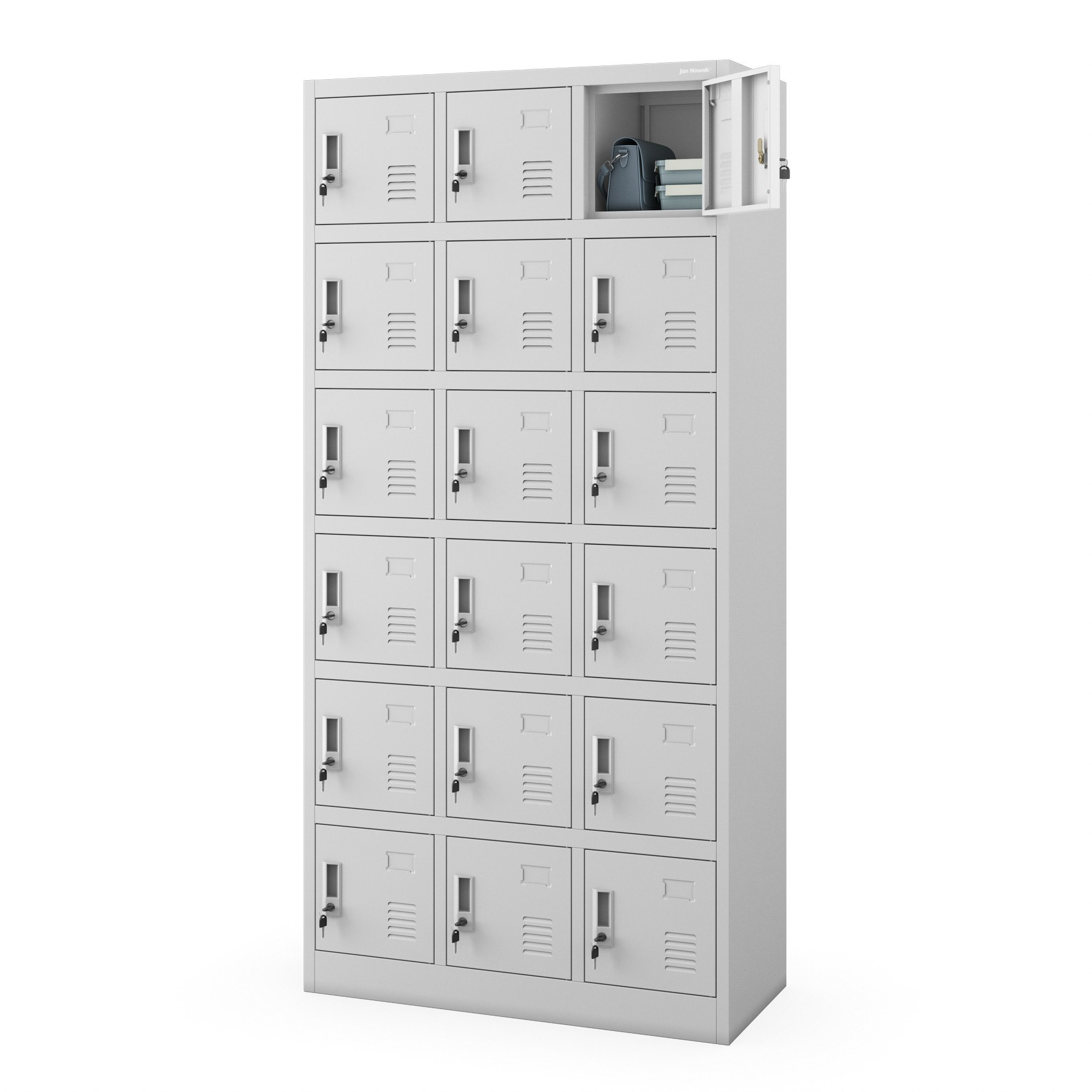A közösségi öltözőszekrény elengedhetetlen minden öltözőben. A KAROL modell az Eco Design kollekcióból lehetővé teszi a tér maximális kihasználását és a ruhák, cipők és személyes tárgyak kényelmes tárolását. A kompakt méreteknek és a 18 különálló rekesznek köszönhetően lehetővé teszi a rendelkezésre álló hely maximális kihasználását. A KAROL modell kiválóan alkalmas munkahelyi, iskolai, edzőtermi vagy uszodai öltözőkbe.
