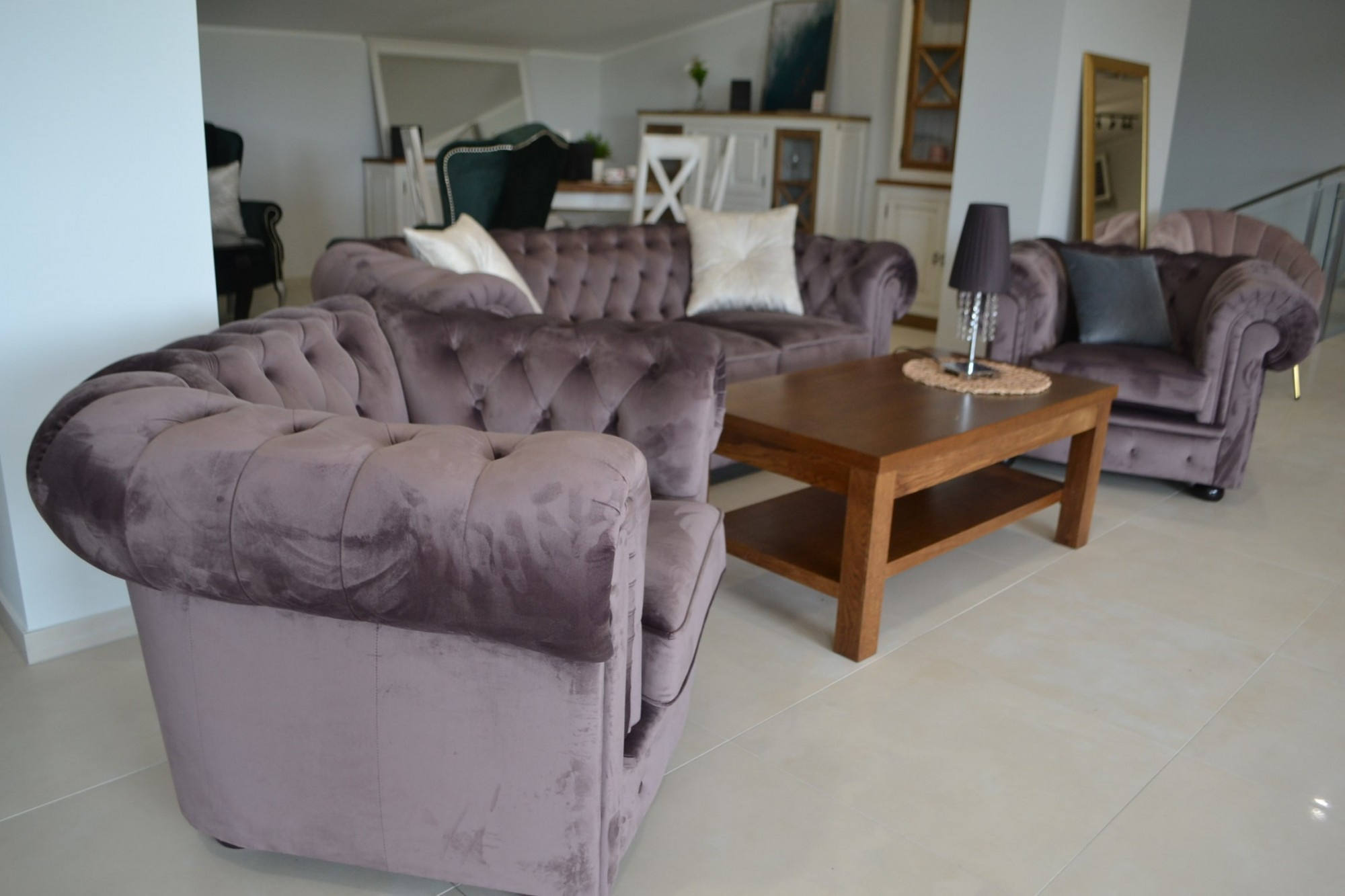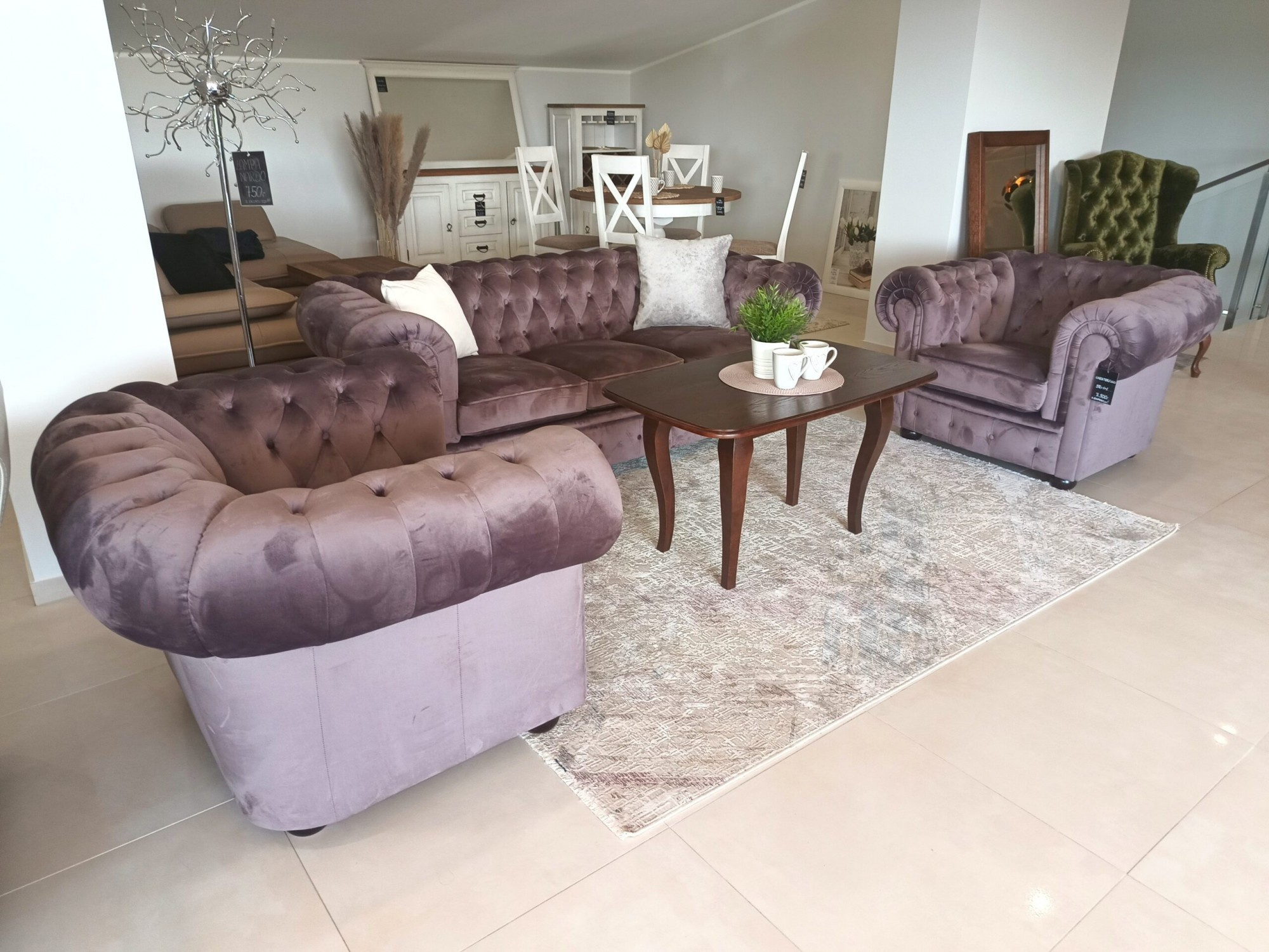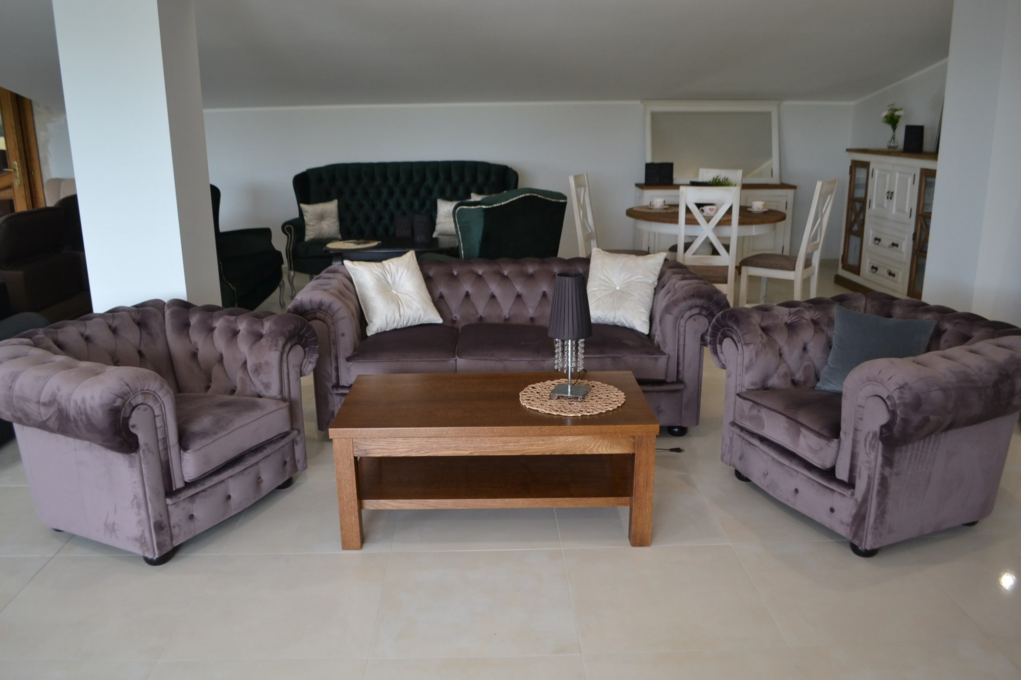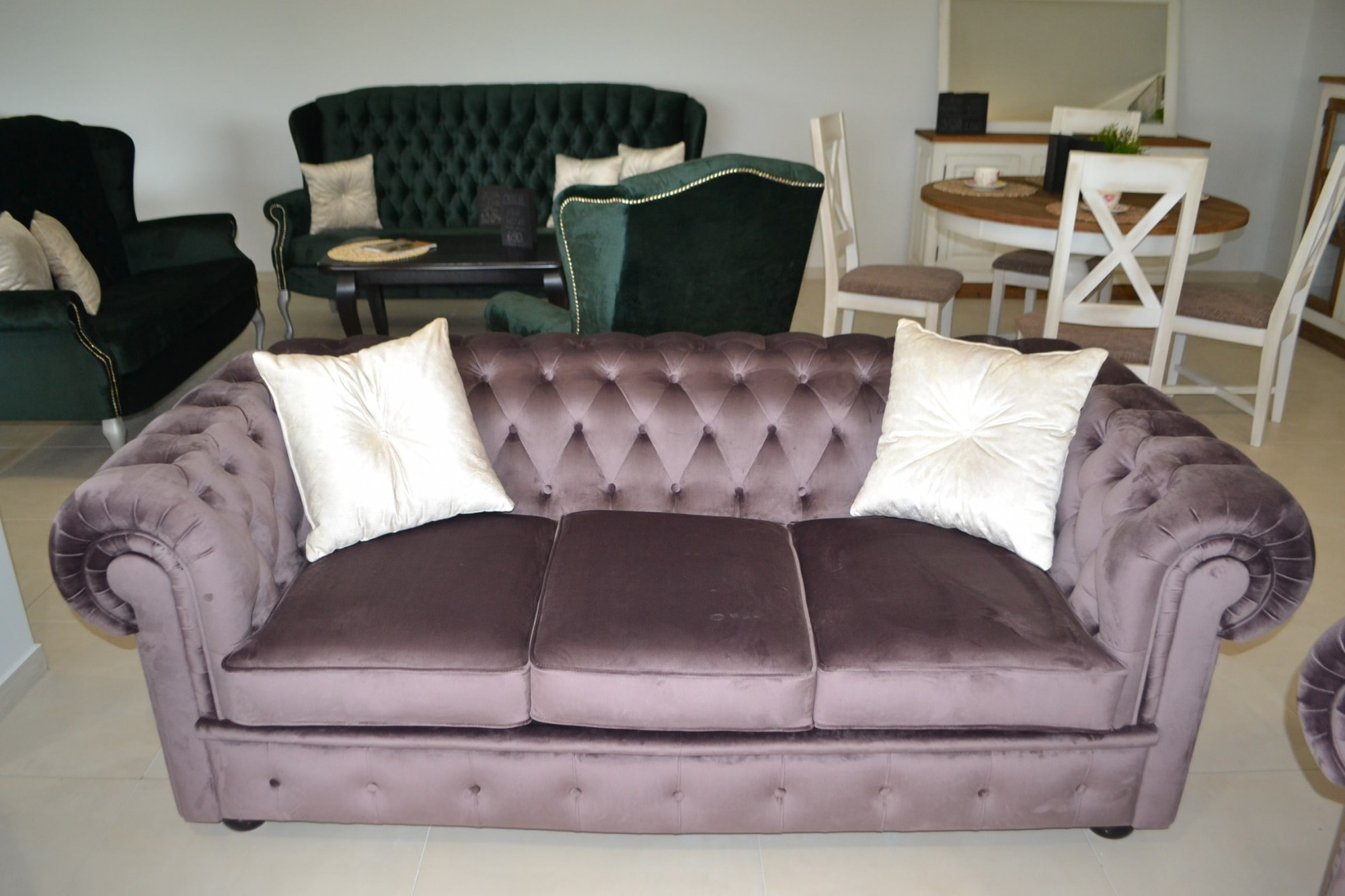 Poprzez klasyczną elegancję Chesterfield doskonale komponuje się zarówno z nowoczesnymi jak i stylowymi meblami. Mebel ten charakteryzuje się pikowaniami dzięki temu jest jedynym z najbardziej rozpoznawalnych kompletów mebli na całym świecie. Idealnie wkomponuje się we wnętrze w stylu Glamour. \n \n \n \nSpecyfikacja: \n \n-Sprężyna bonelowa, \n-Pianka wysokosprężysta HR, \n-Funkcja spania okazjonalnego w kanapie 3-osobowej, \n-Ozdobne pikowania, \n-Drewniane nóżki.