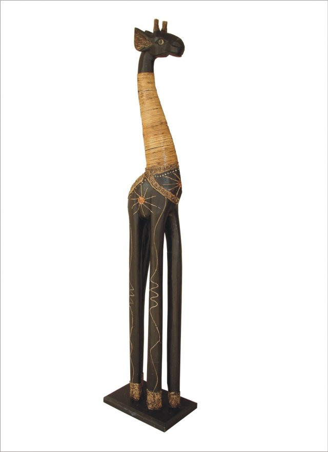 Žirafa je vyřezána ručně z masivního měkkého dřeva, barvena je taktéž ručně, každý kus je tak originál. Zdobení je doplněno přírodním ratanem. | Výška žirafy je 80 cm.